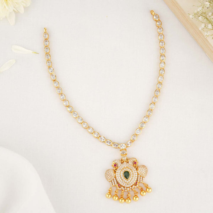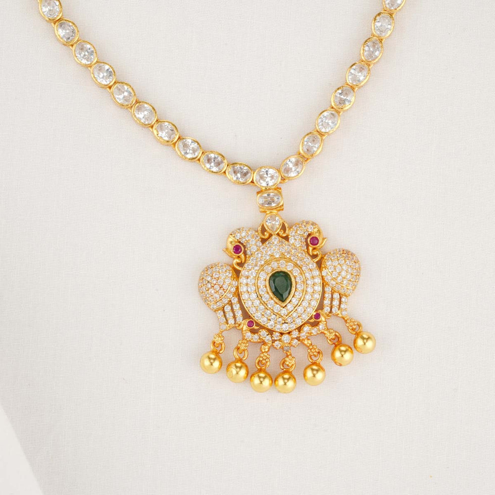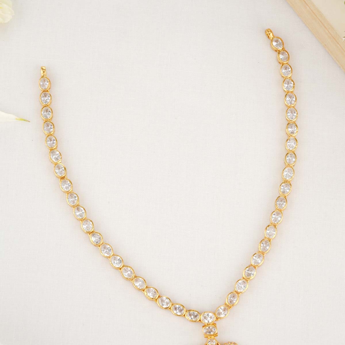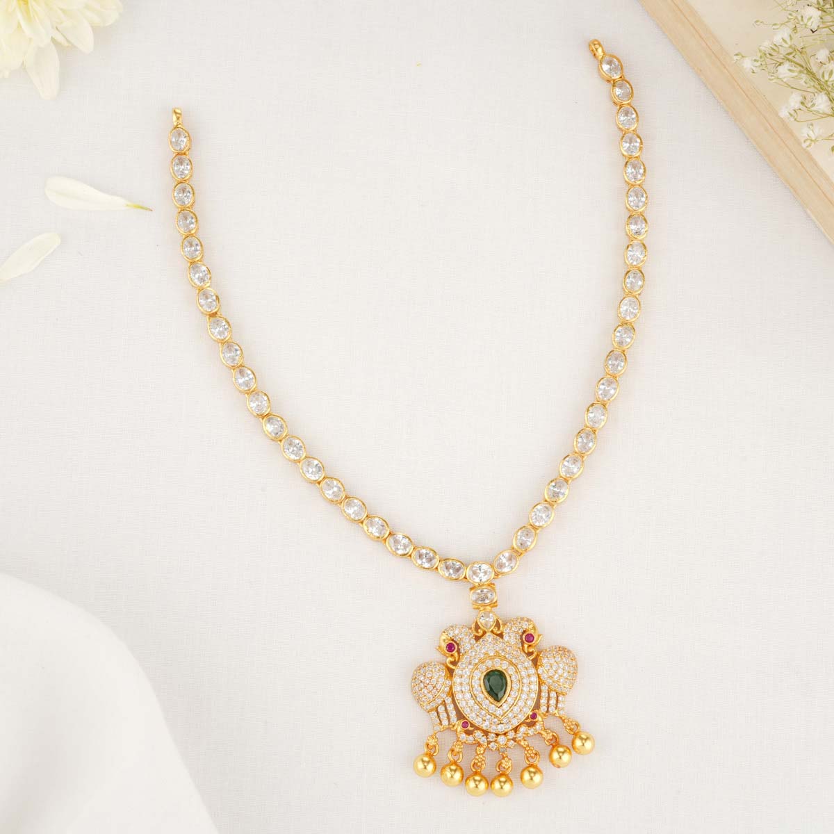 This 92.5 Silver, 24 kt gold-plated stylish Necklace is studded with semi-precious stones to make a stunning statement. Perfect for any special occasion.