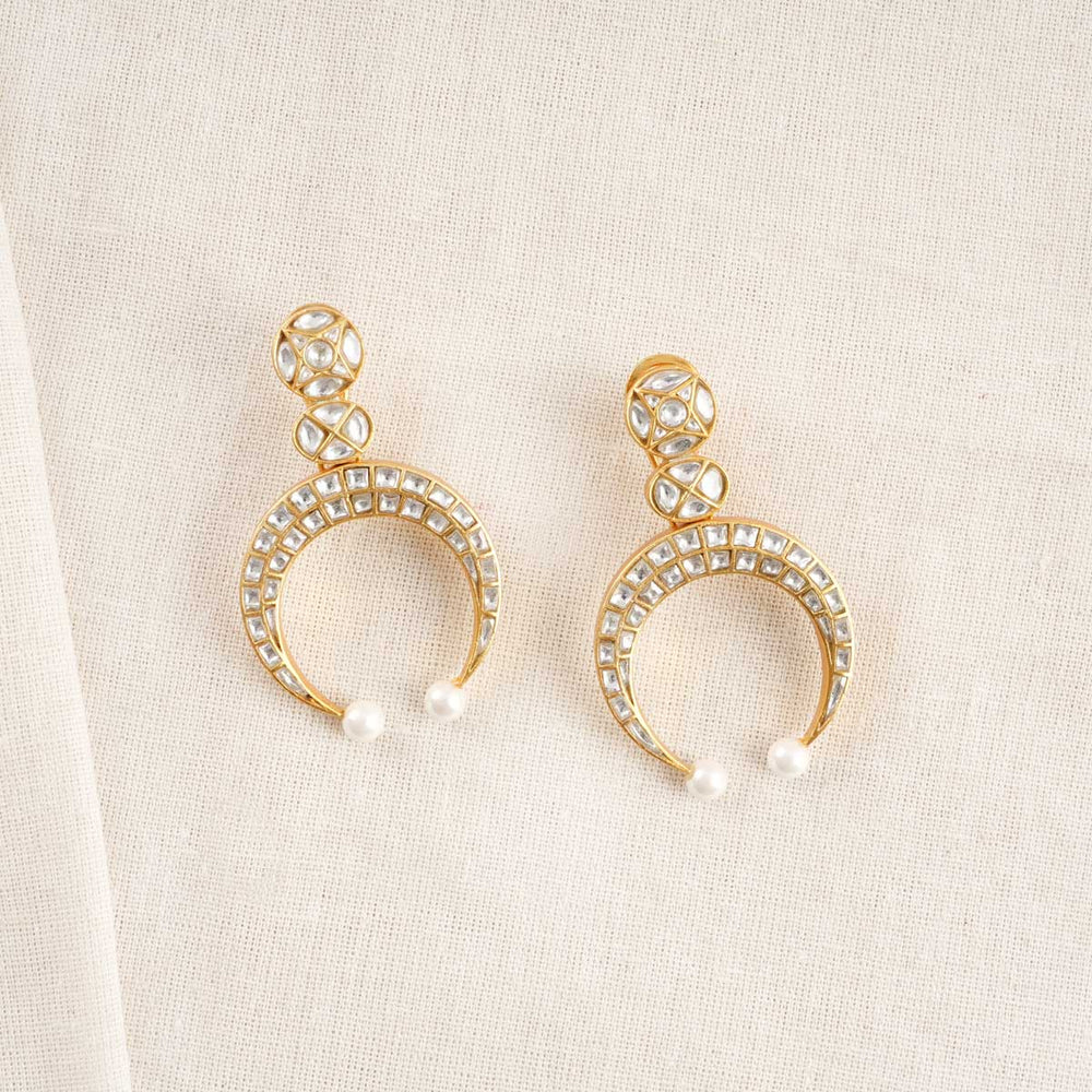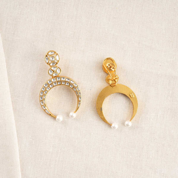This 92.5 Silver, 24 kt Gold-Plated Earring is adorned with Semi-precious Kundan Stones for a luxurious aesthetic.