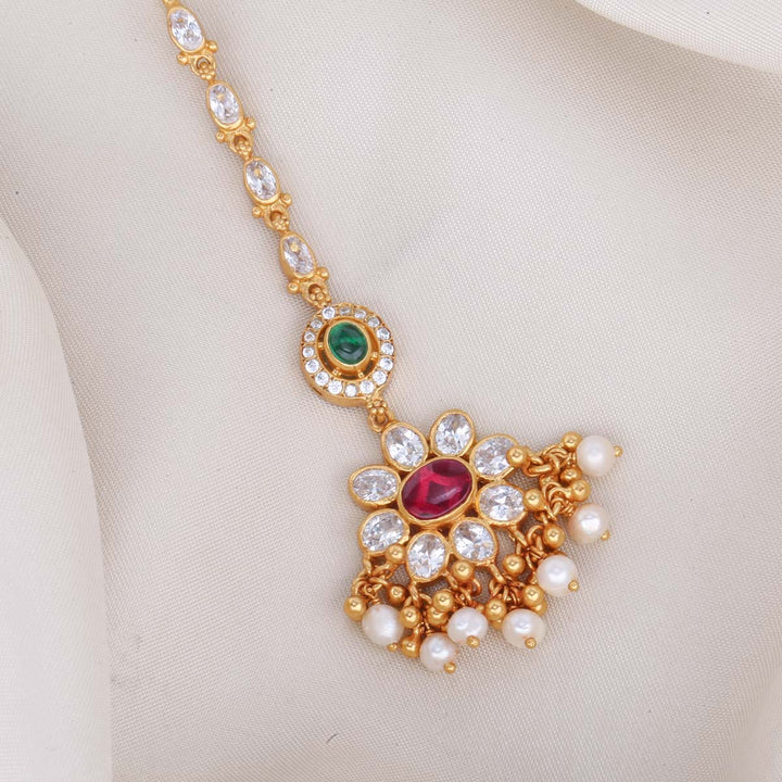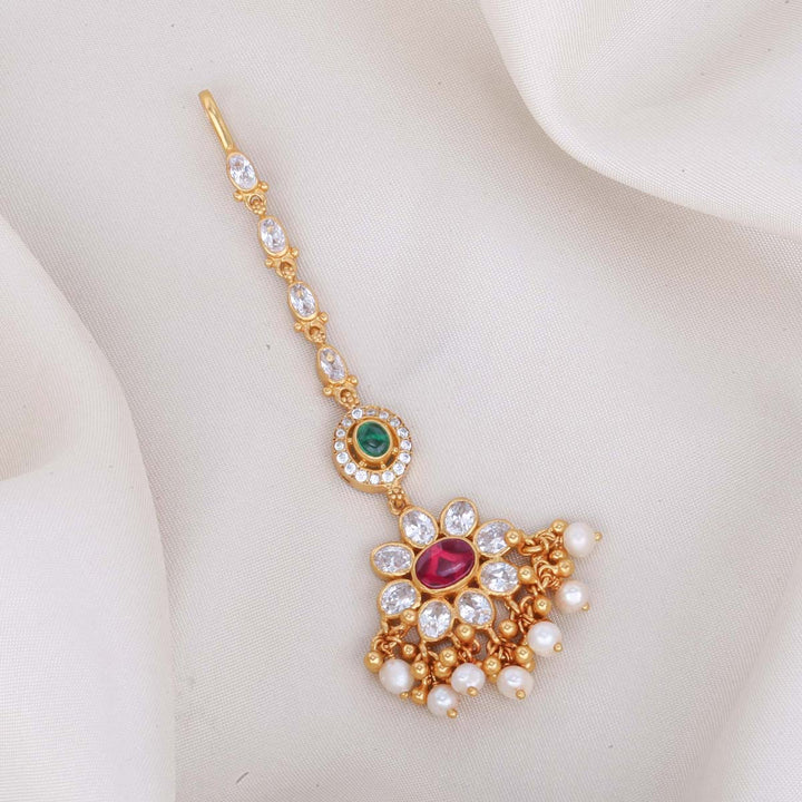 This Kairavi Maangtikka is crafted with 92.5% silver and 24kt gold plating, featuring authentic semi-precious stones for a unique and exquisite look. An exquisite adornment for any special occasion, it's the perfect accessory for elevating your style.
