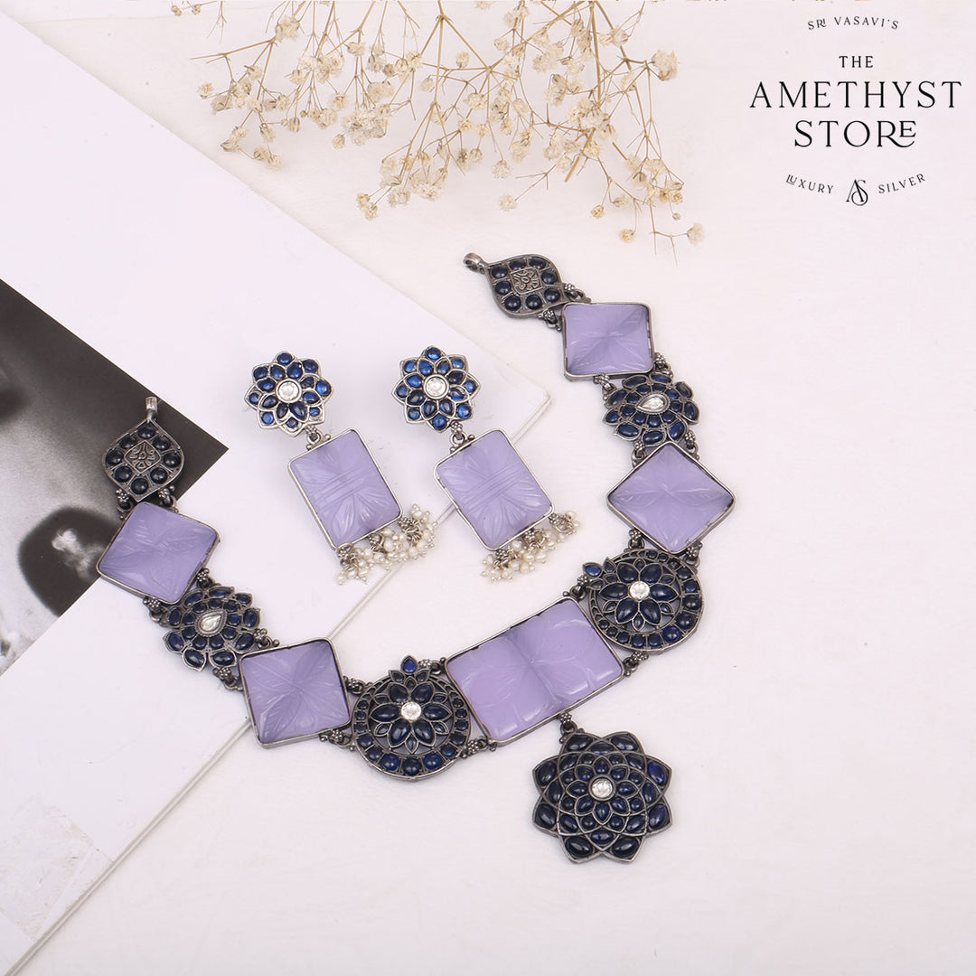 92.5 silver oxidized Necklace Set, Studded with Semi-Precious Stones.
