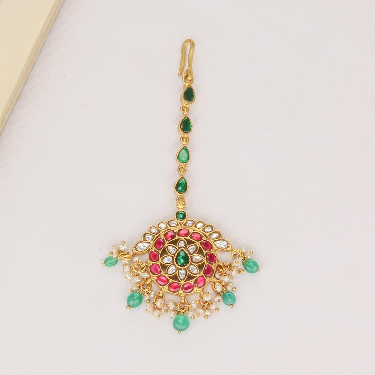 This 92.5 Silver, 24 kt Gold-Plated Maangtikka is adorned with Semi-precious Kundan Stones for a luxurious aesthetic.