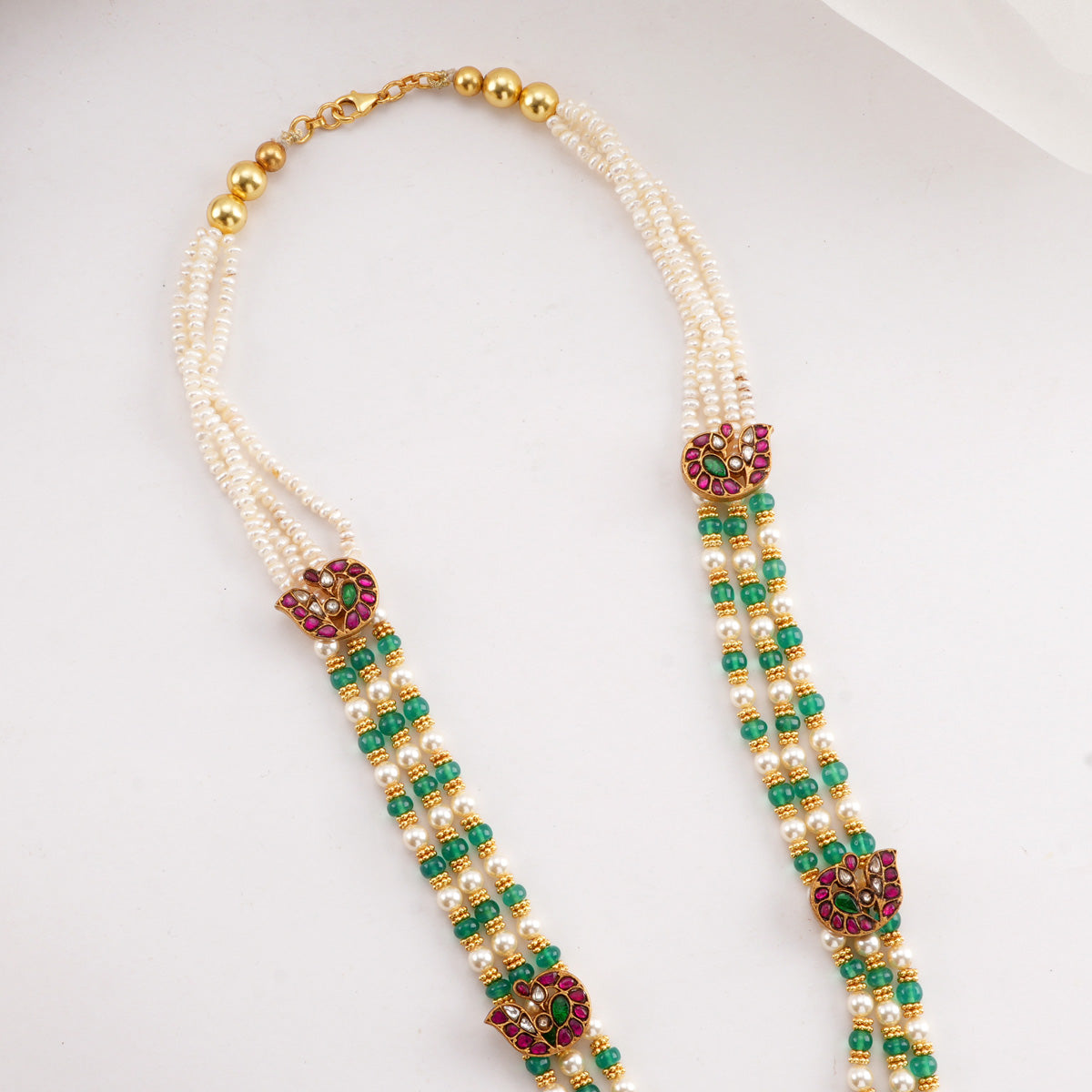 This 92.5 Silver, 24 kt Gold-Plated Necklace is adorned with Semi-precious Kundan Stones for a luxurious aesthetic.