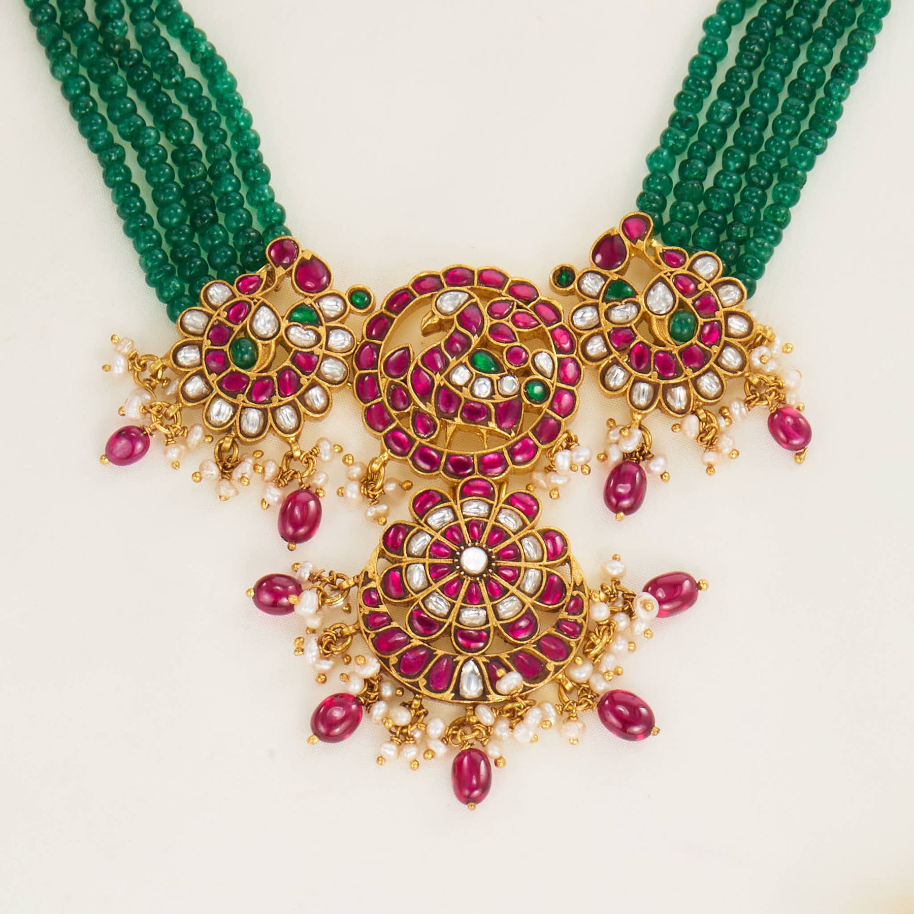 This 92.5 Silver, 24 kt Gold-Plated Necklace is adorned with Semi-precious Kundan Stones along with the Green beads at the side of the necklace with the peacock and the floral inspiring design with hanging pearls & Red beads.