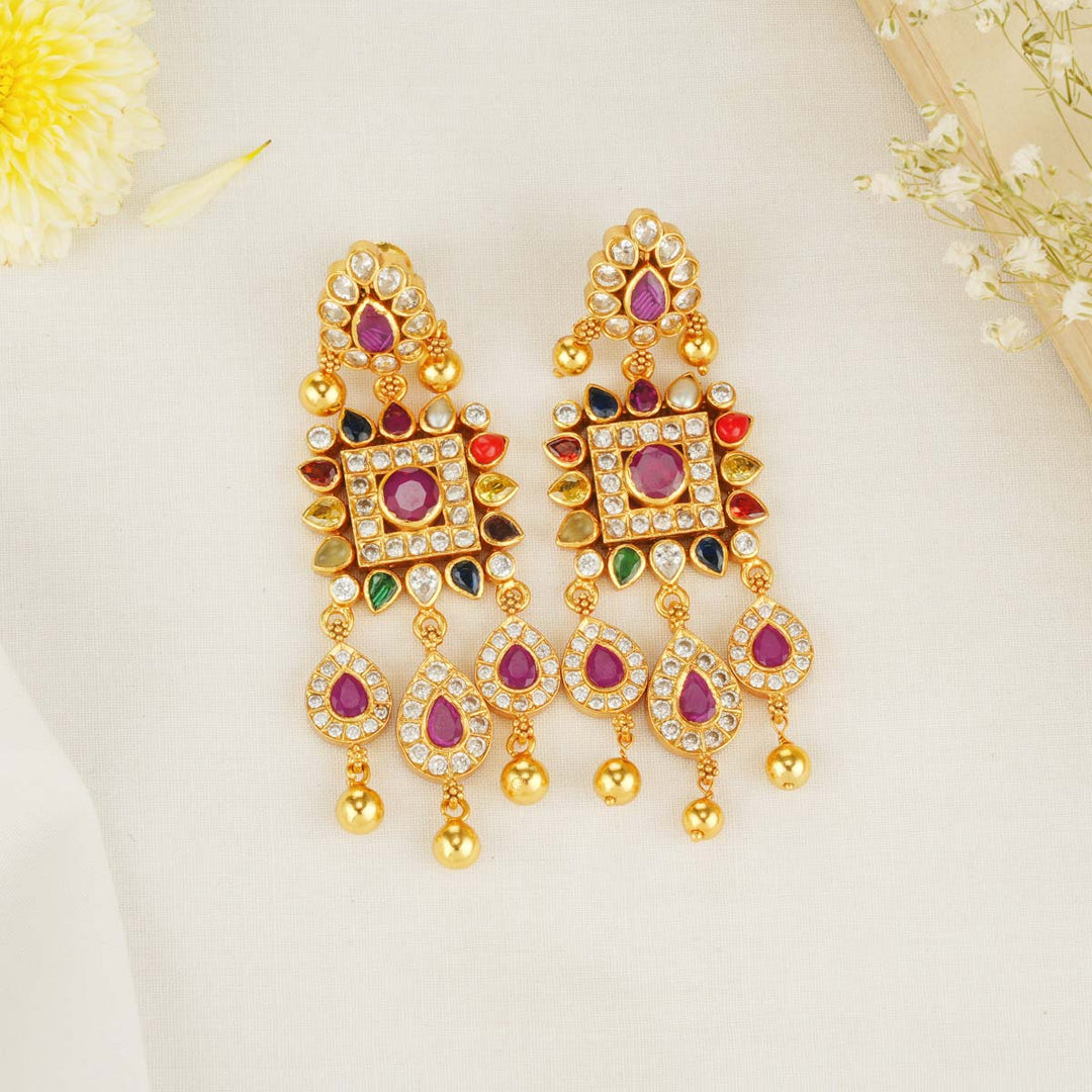 These earrings are crafted from 92.5 silver and 24kt gold-plated metals, with semi-precious stones embedded for added sparkle.