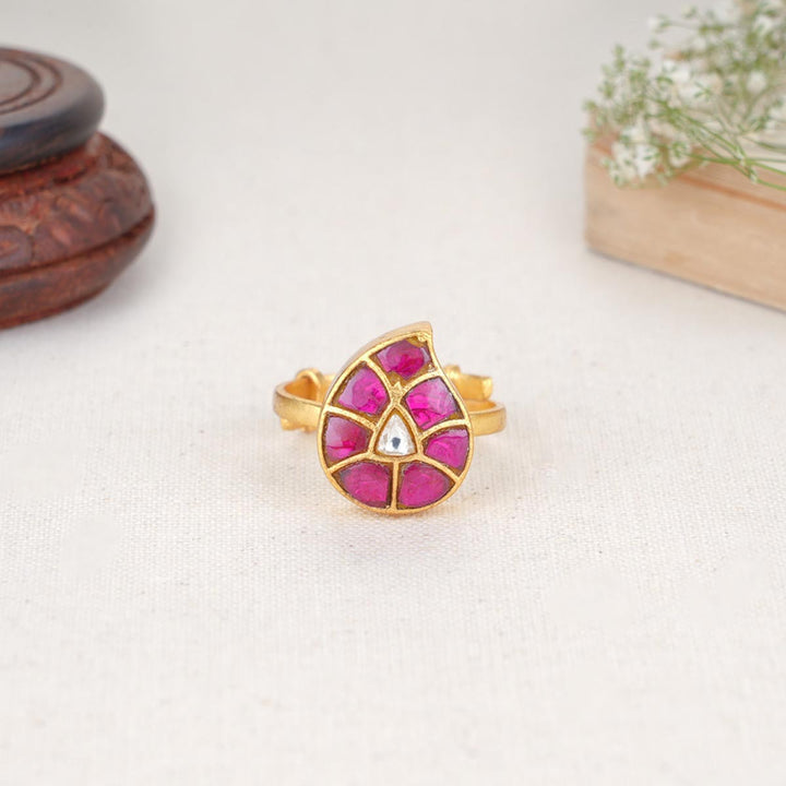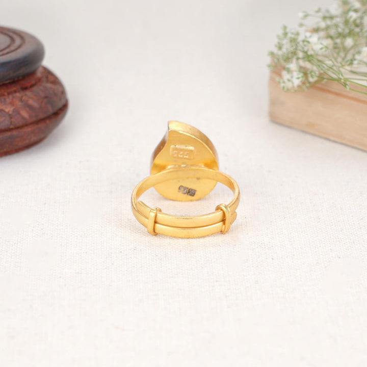 This 92.5 Silver, 24 kt Gold-Plated Ring is adorned with Semi-precious Kundan Stones for a luxurious aesthetic.
