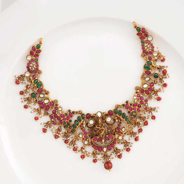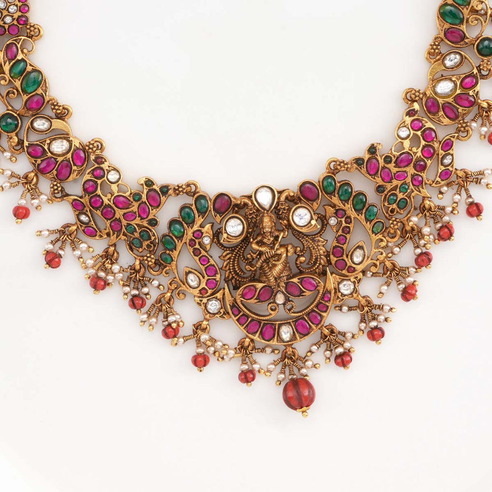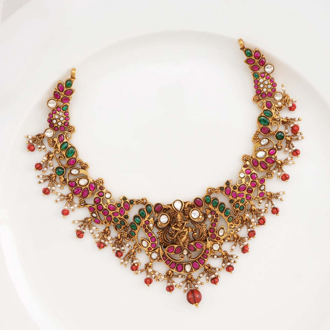 This 92.5 Silver, 24 kt Gold-Plated Necklace is adorned with Semi-precious Kundan Stones for a luxurious aesthetic.