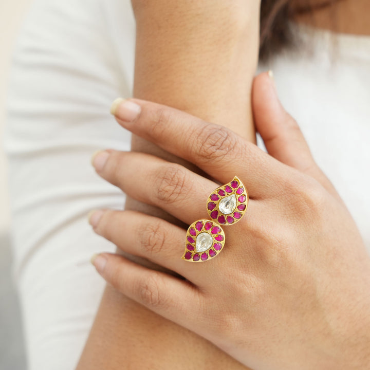 This 92.5 Silver, 24 kt Gold-Plated Ring is adorned with Semi-precious Kundan Stones for a luxurious aesthetic.