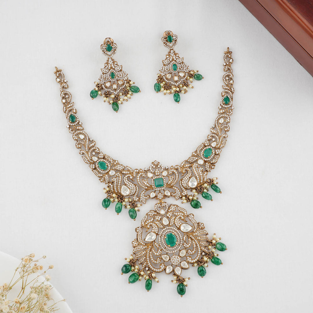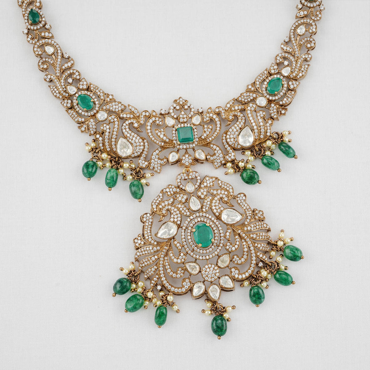 92.5 Silver, Victorian Necklace set studded with Gem Stones and Pearl Beads.