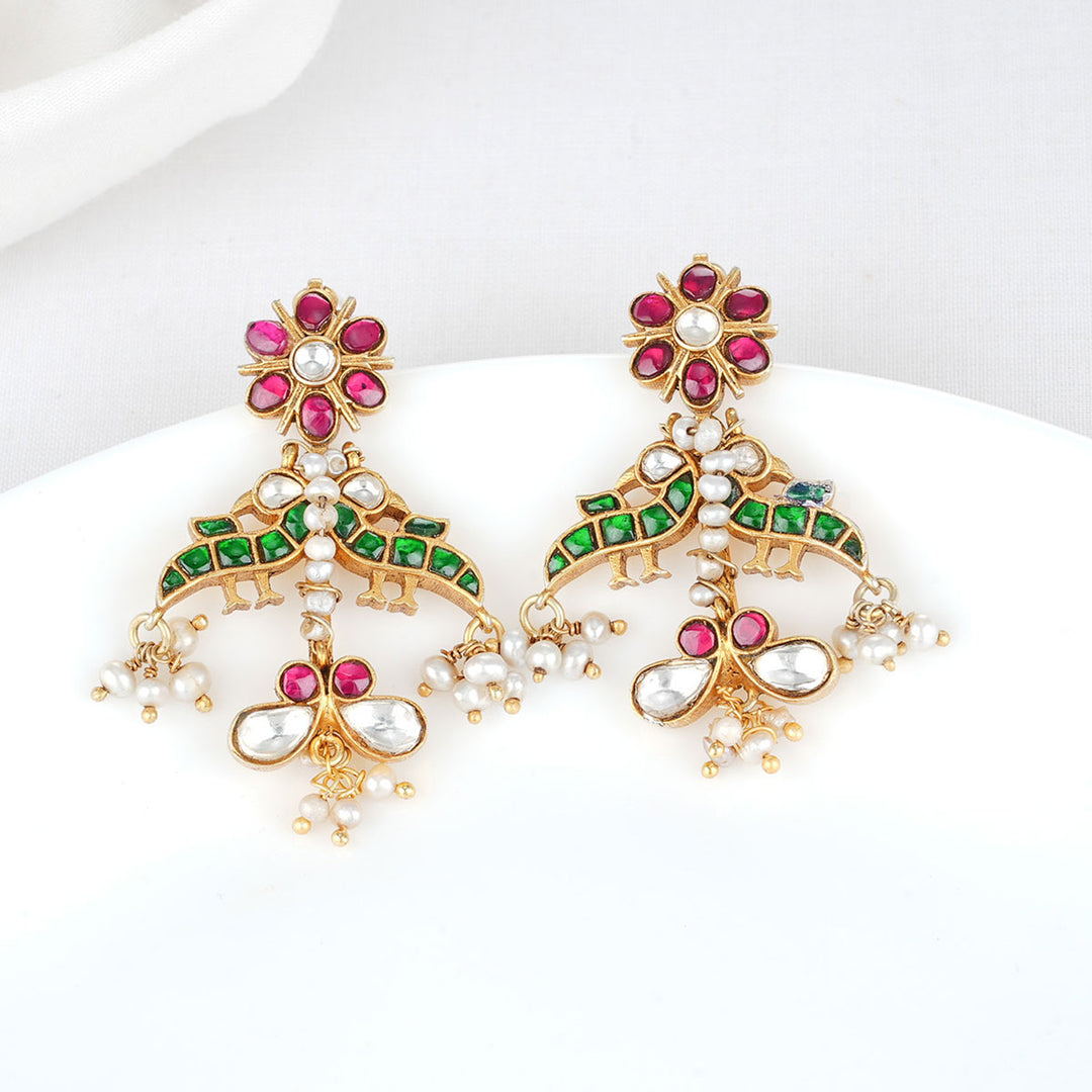 This 92.5 Silver, 24 kt Gold-Plated Earring is adorned with Semi-precious Kundan Stones for a luxurious aesthetic.