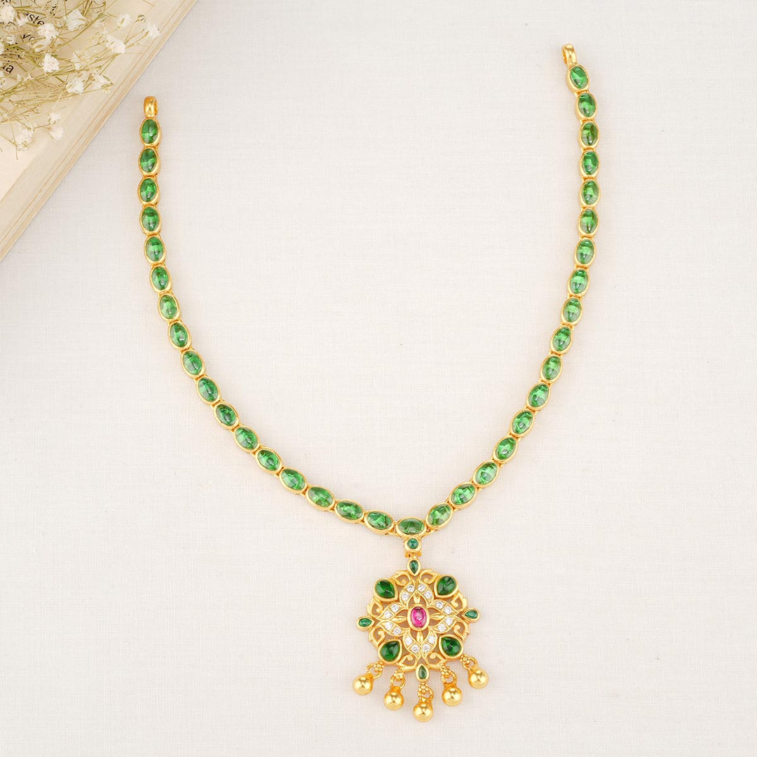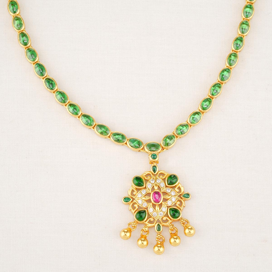 This 92.5 Silver, 24 kt gold-plated stylish Necklace is studded with semi-precious stones to make a stunning statement. Perfect for any special occasion.
