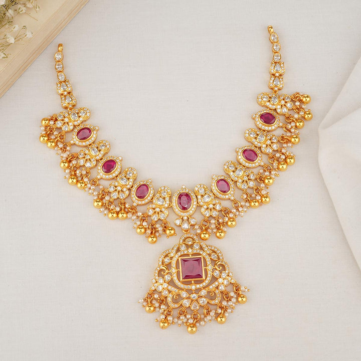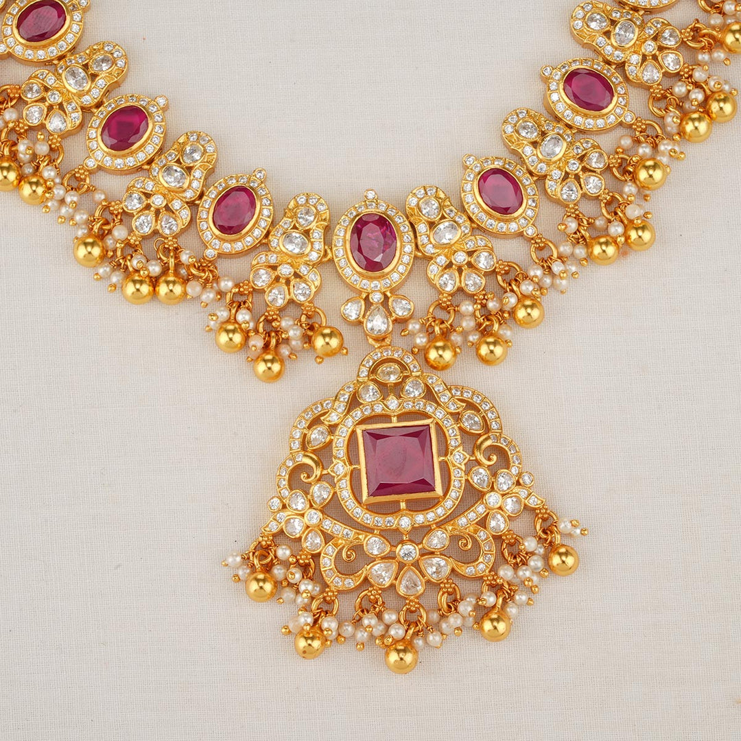 This 92.5 Silver, 24 kt gold-plated stylish Necklace is studded with semi-precious stones to make a stunning statement. Perfect for any special occasion.