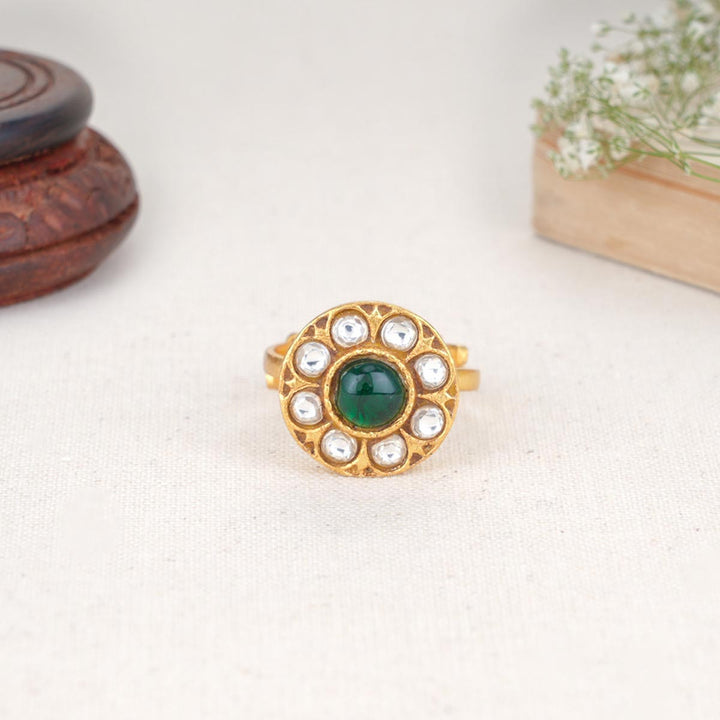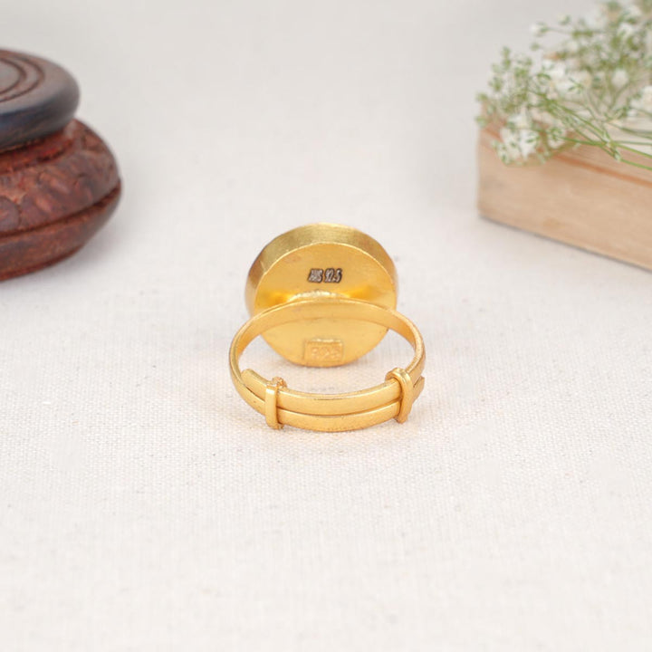 This 92.5 Silver, 24 kt Gold-Plated Ring is adorned with Semi-precious Kundan Stones for a luxurious aesthetic.