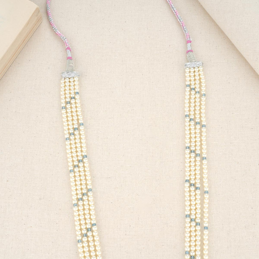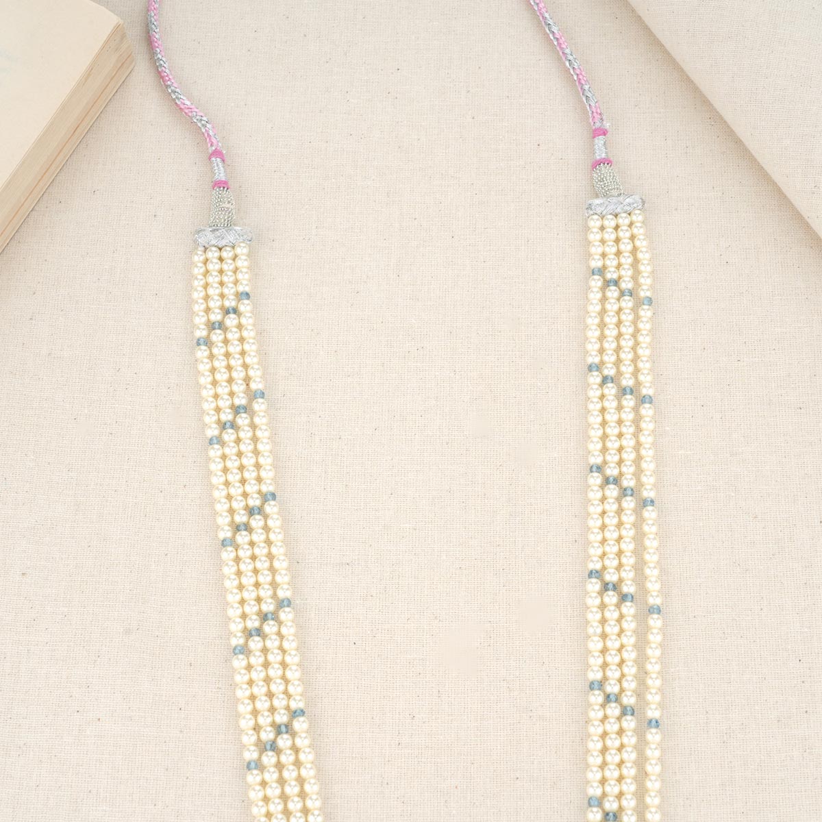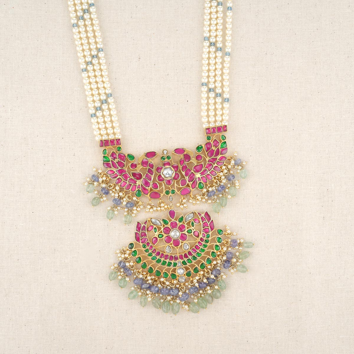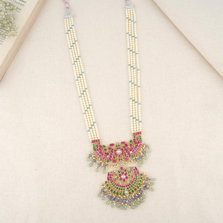 This 92.5 Silver, 24 kt Gold-Plated Necklace is adorned with Semi-precious Kundan Stones for a luxurious aesthetic.