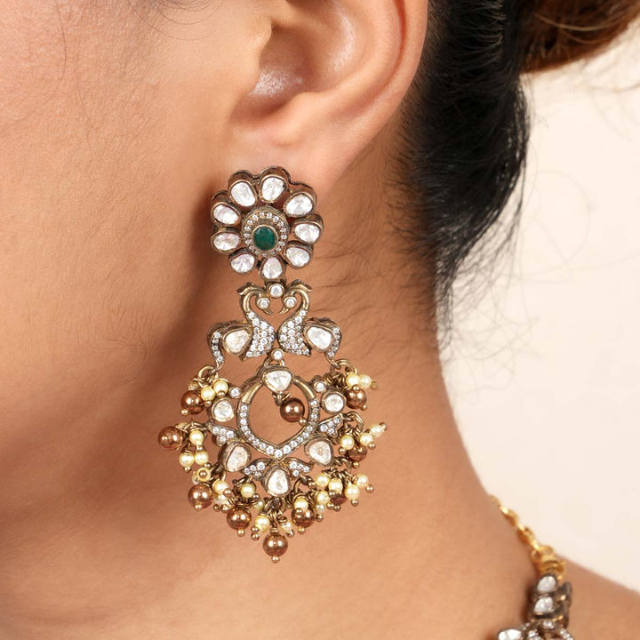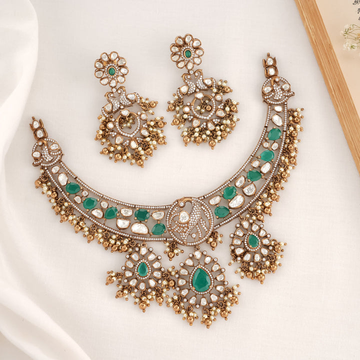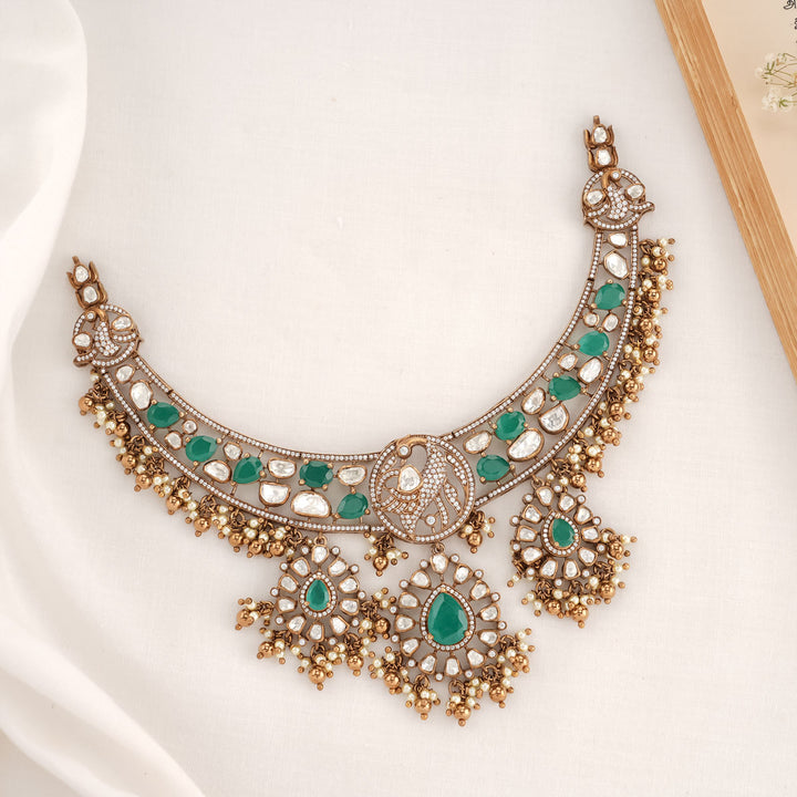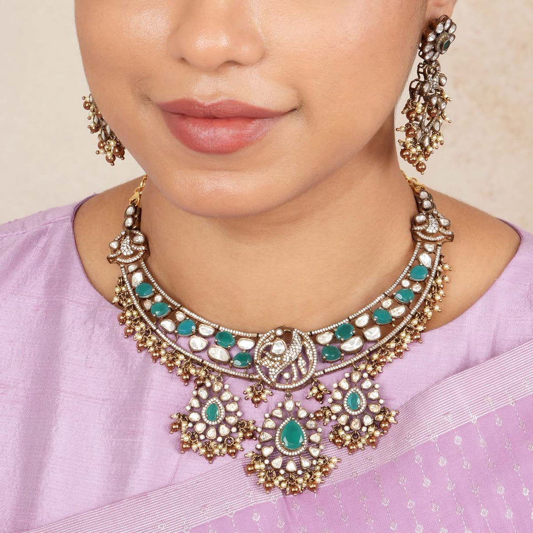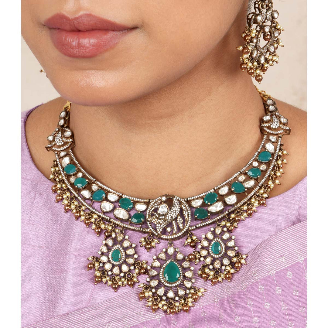 92.5 Silver, Victorian Necklace set studded with Gem Stones and Pearl Beads.