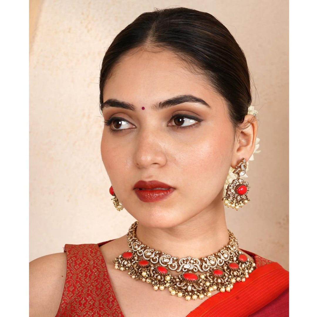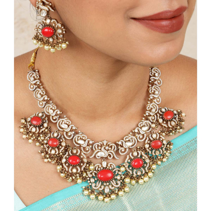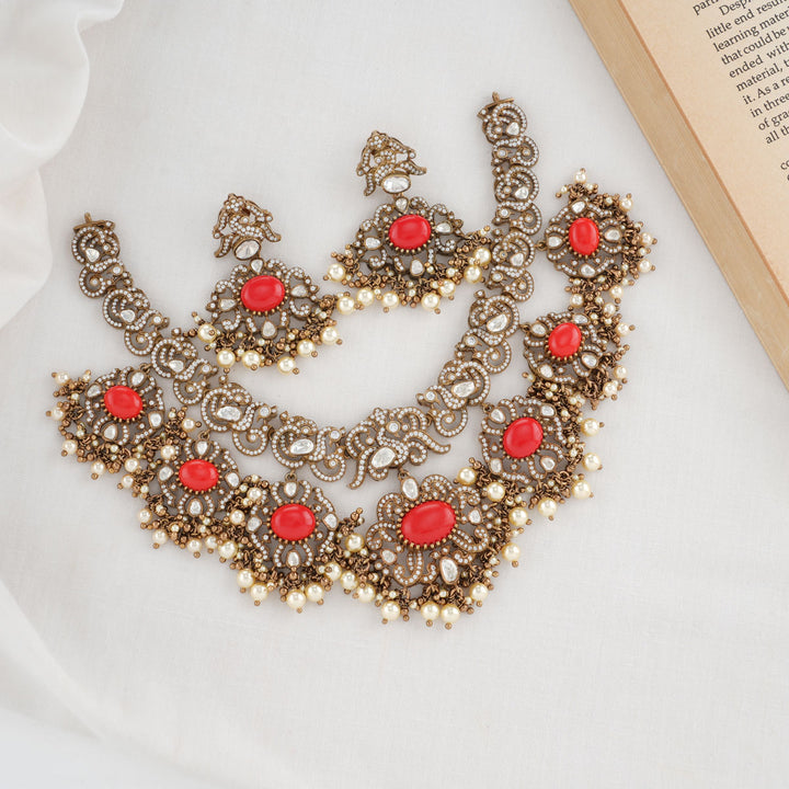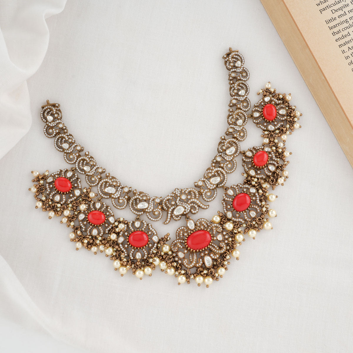 92.5 Silver, Victorian Necklace set studded with Gem Stones and Pearl Beads.