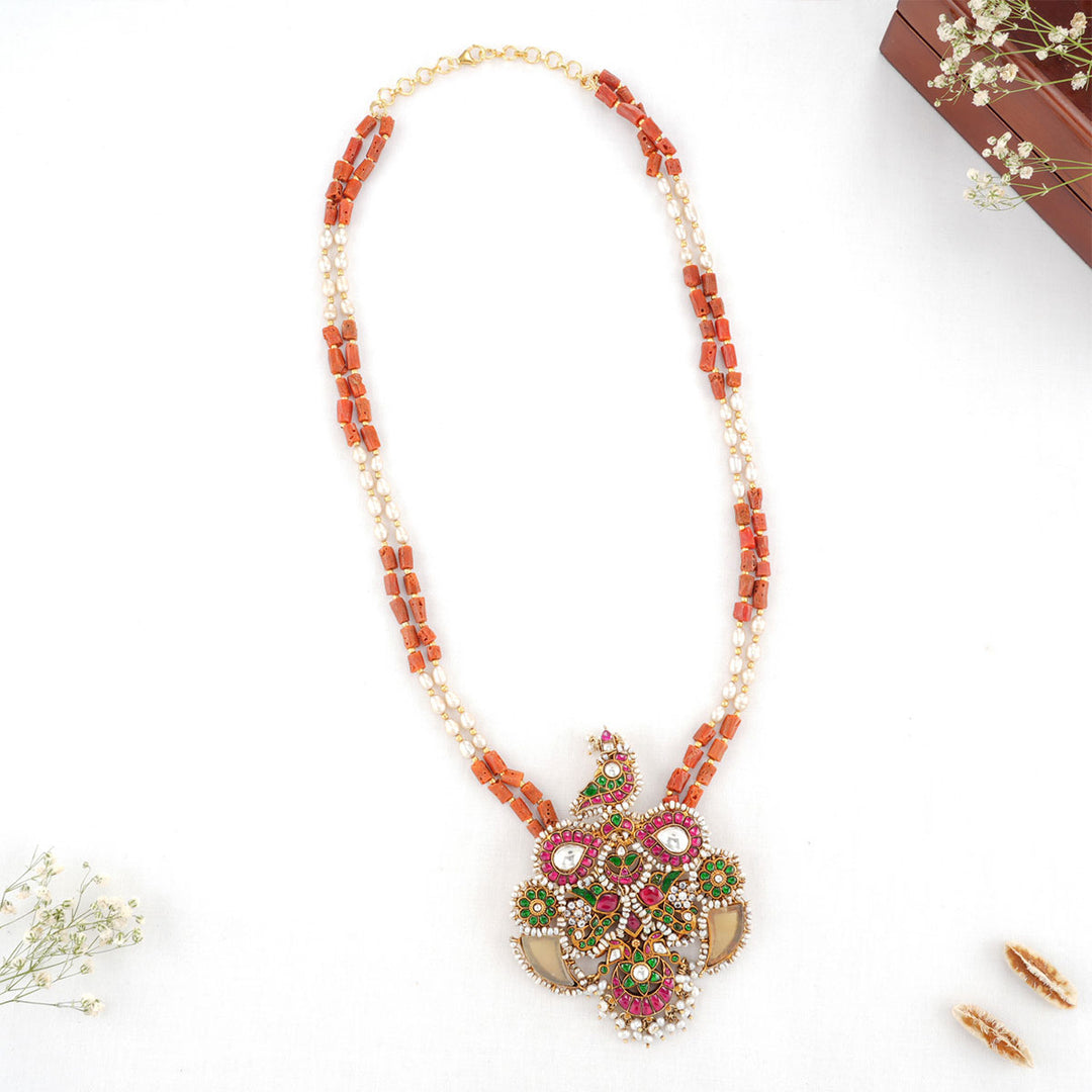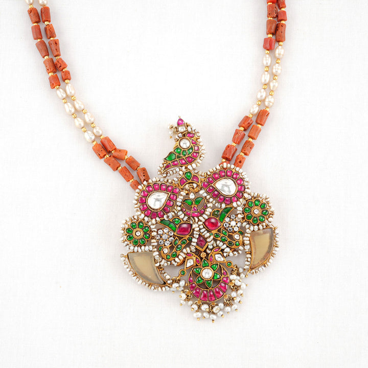 This 92.5 Silver, 24 kt Gold-Plated Necklace is adorned with Semi-precious Kundan Stones for a luxurious aesthetic.