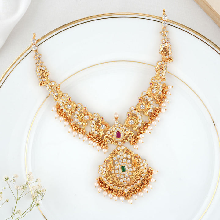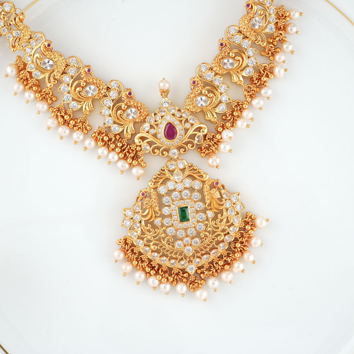 This 92.5 Silver, 24 kt gold-plated stylish Necklace is studded with semi-precious stones to make a stunning statement. Perfect for any special occasion.