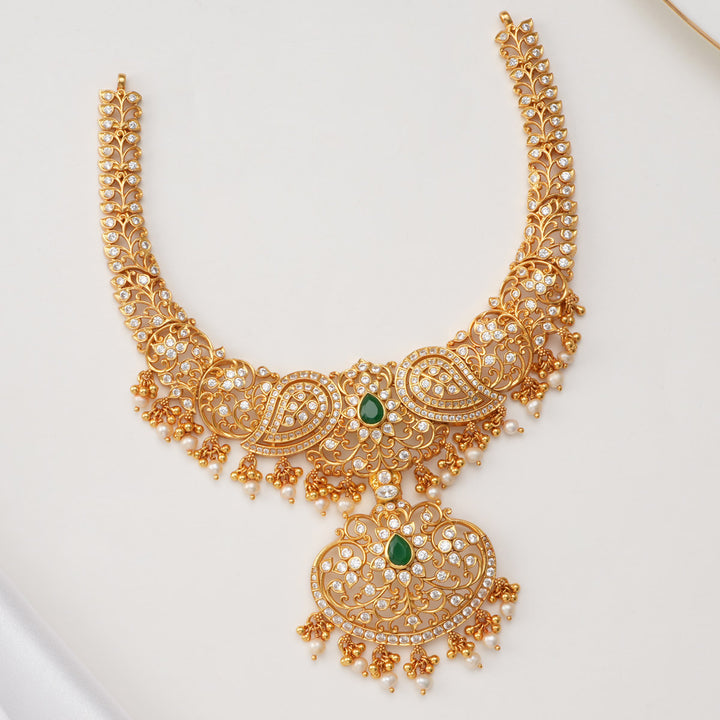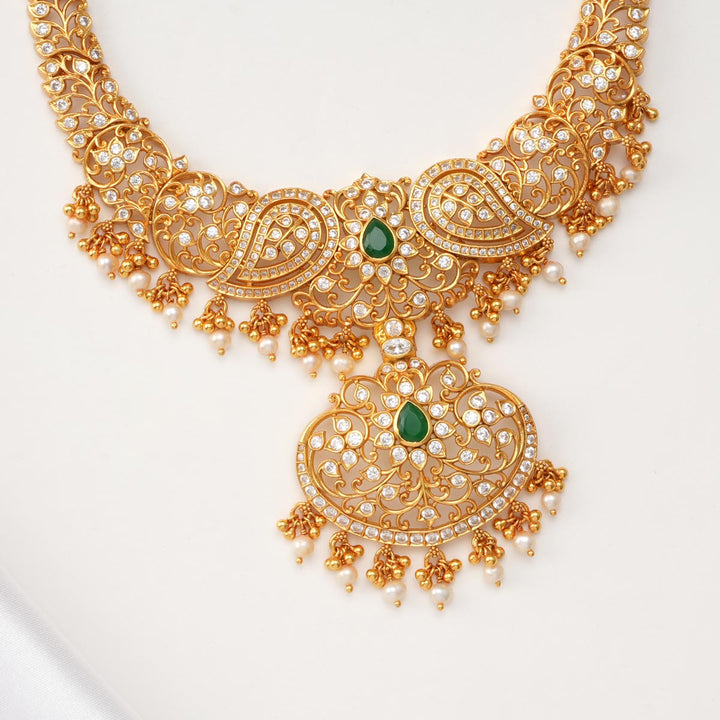 This 92.5 Silver, 24 kt gold-plated stylish Necklace is studded with semi-precious stones to make a stunning statement. Perfect for any special occasion.