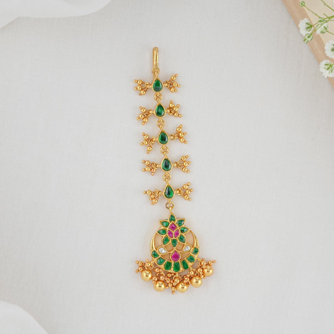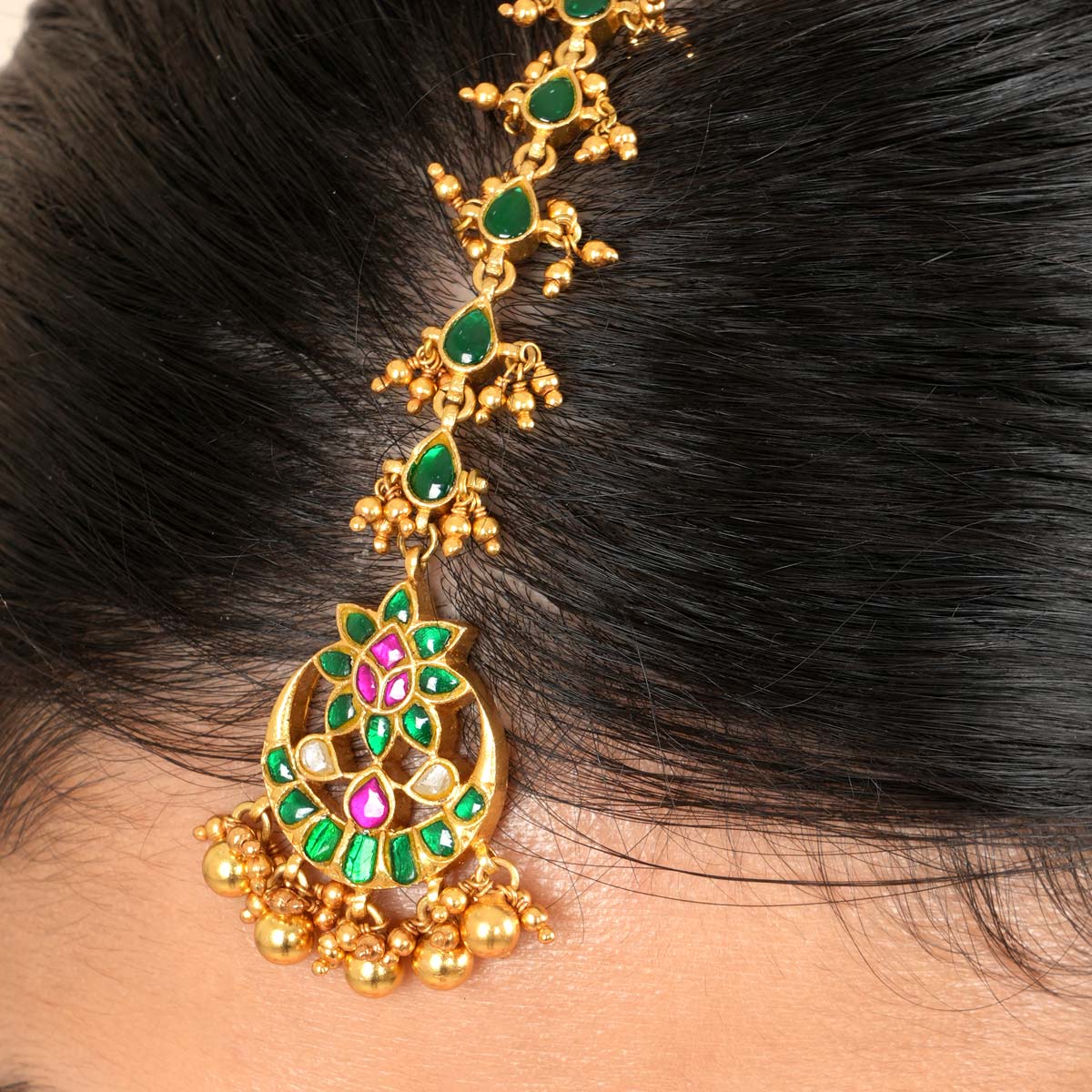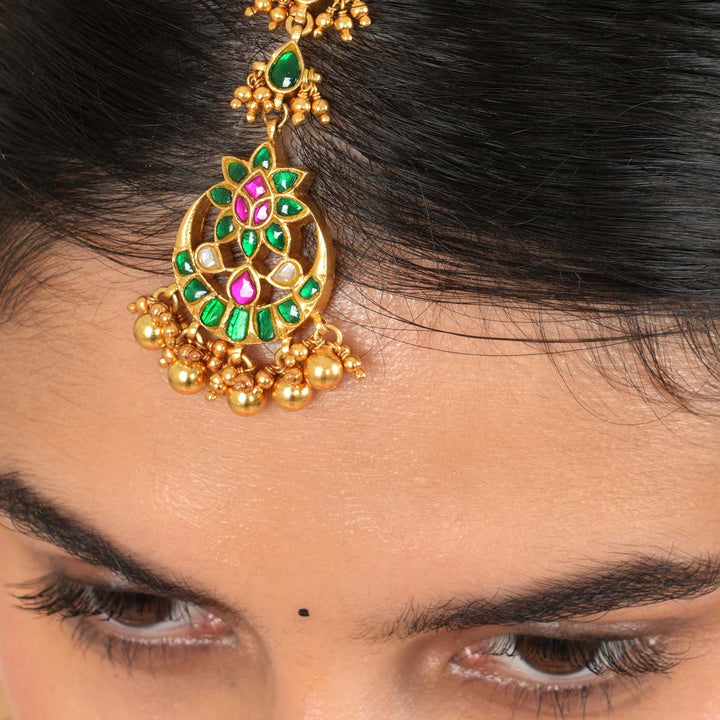 This 92.5 Silver, 24 kt Gold-Plated Maangtikka is adorned with Semi-precious Kundan Stones for a luxurious aesthetic.