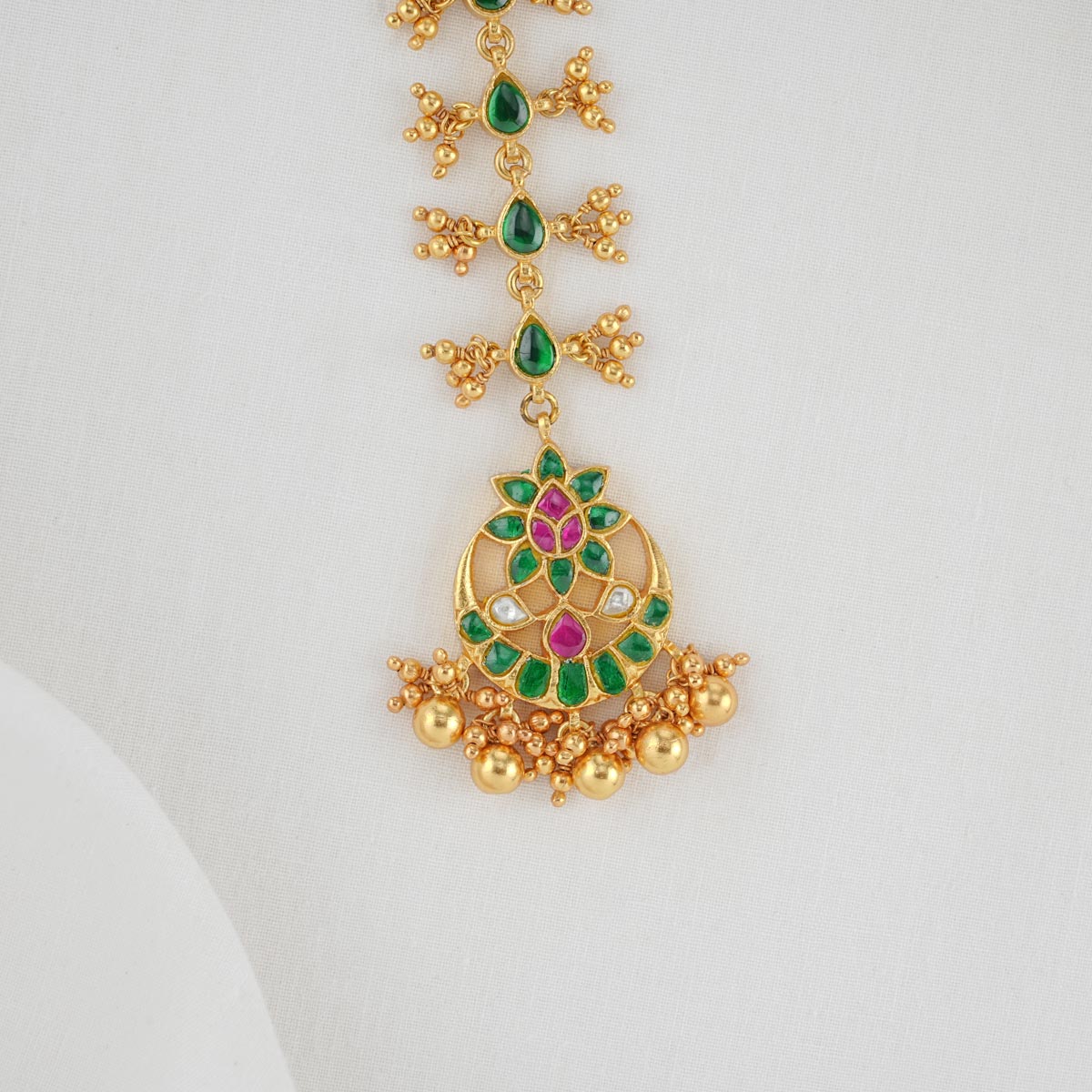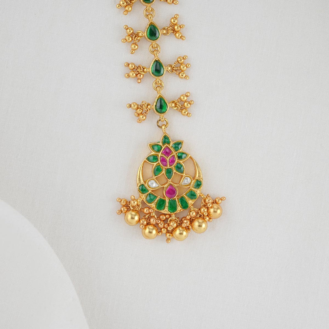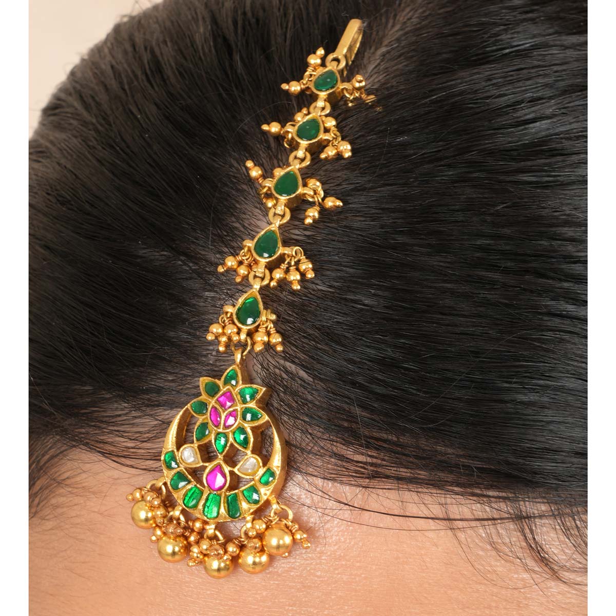 This 92.5 Silver, 24 kt Gold-Plated Maangtikka is adorned with Semi-precious Kundan Stones for a luxurious aesthetic.