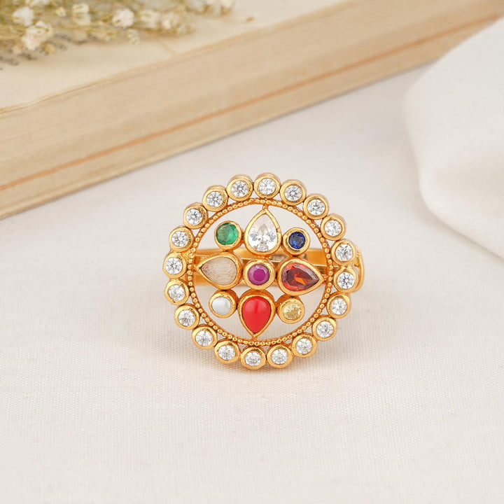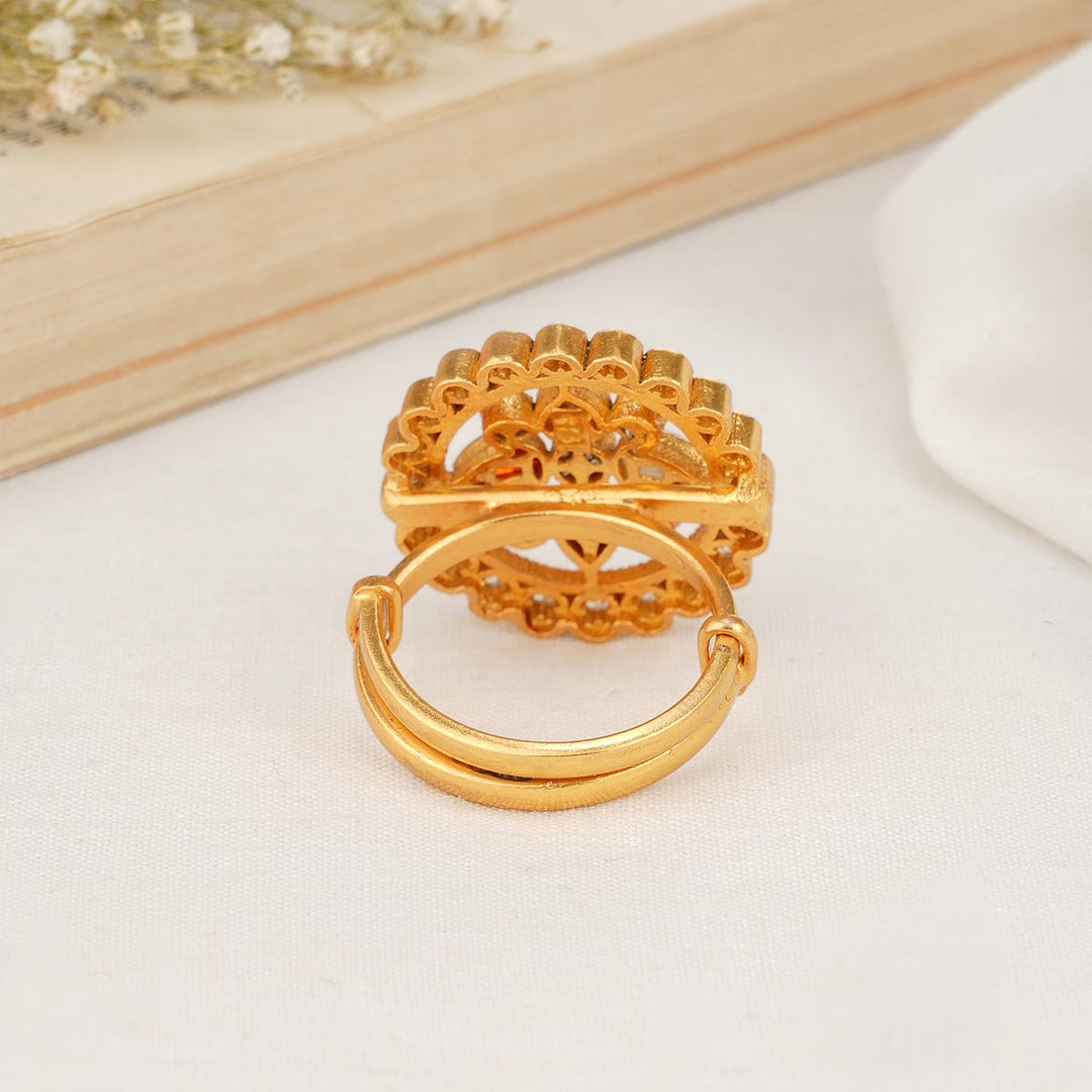 This adjustable ring is crafted with 92.5 sterling silver and plated with 24kt gold. It is adorned with semi-precious stones for a chic finish.