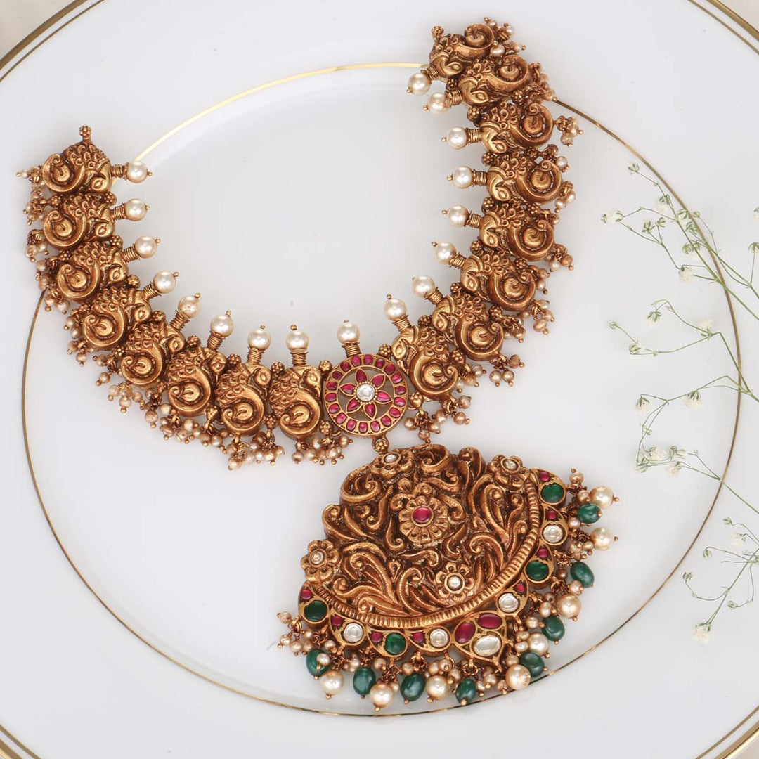 Handcrafted pure 92.5 sliver gold plated deep nagas jewellry. This is a fusion of deep nagas and Kundan's work. It takes about 100 days to make this one-of-a-kind masterpiece. We are proud to say that we are the first brand in India to launch this collection.