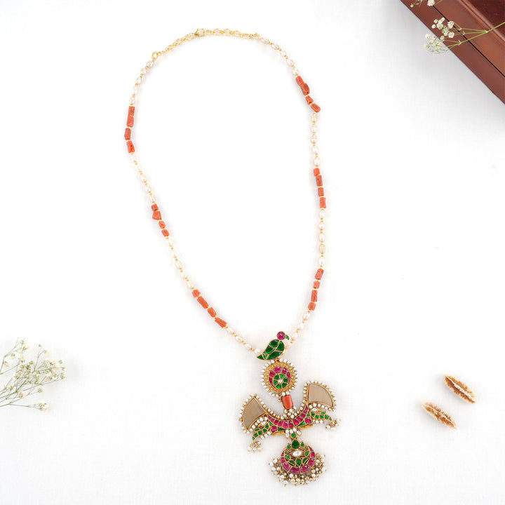 This 92.5 Silver, 24 kt Gold-Plated Necklace is adorned with Semi-precious Kundan Stones for a luxurious aesthetic.
