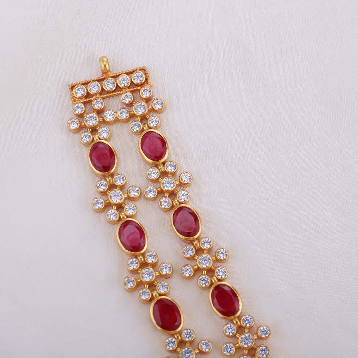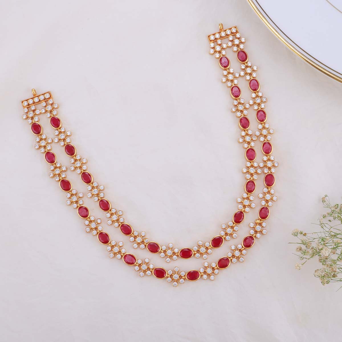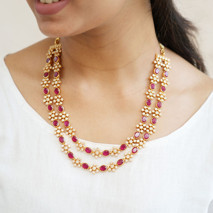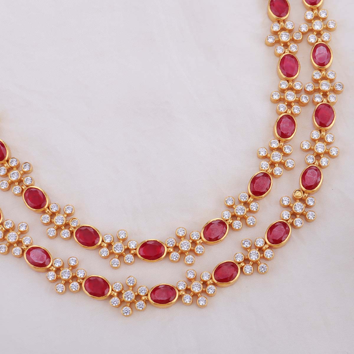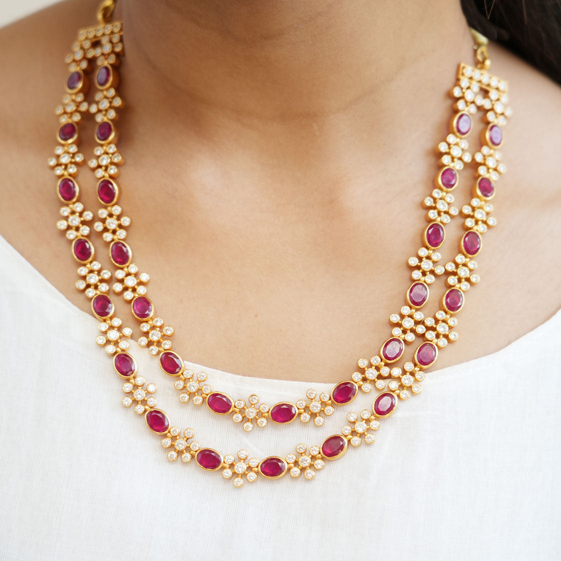 This 92.5 Silver, 24 kt gold-plated stylish Necklace is studded with semi-precious stones to make a stunning statement. Perfect for any special occasion.