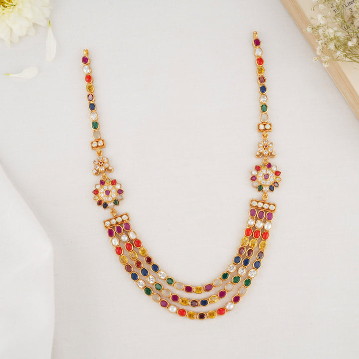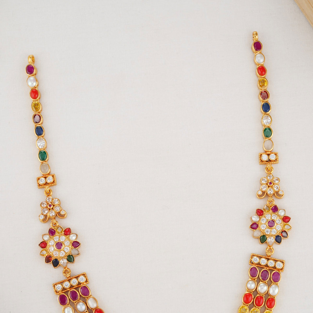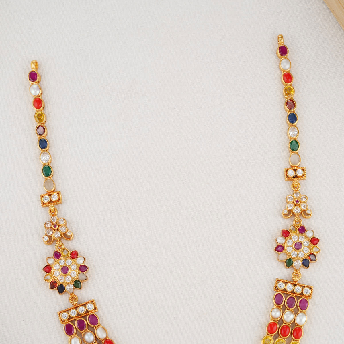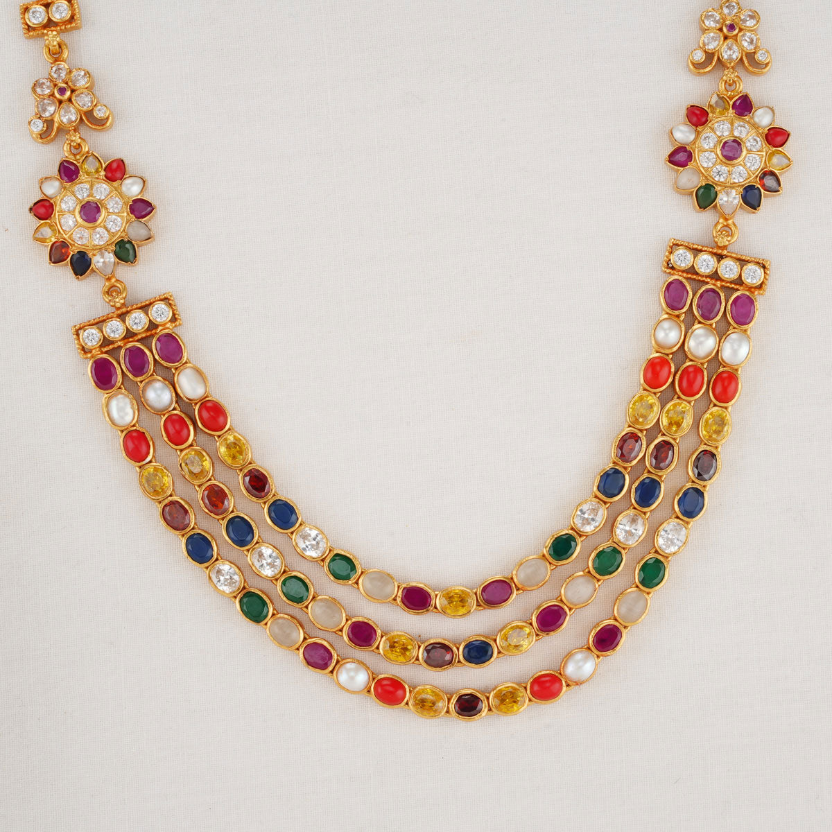 This stylish 92.5 Silver, 24 kt gold-plated Necklace is studded with semi-precious stones to make a stunning statement. It is perfect for any special occasion.
