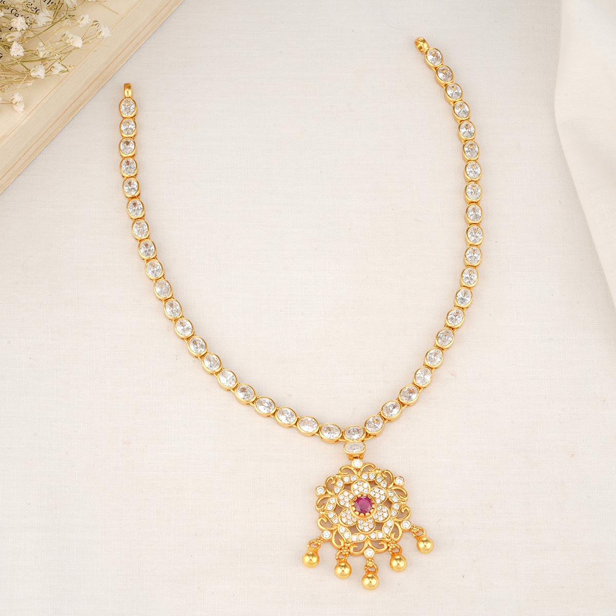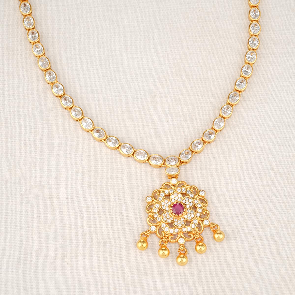 This 92.5 Silver, 24 kt gold-plated stylish Necklace is studded with semi-precious stones to make a stunning statement. Perfect for any special occasion.