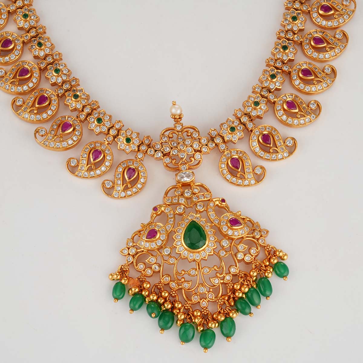 This 92.5 Silver, 24 kt gold-plated, stylish Necklace is studded with semi-precious stones to make a stunning statement. Perfect for any special occasion.