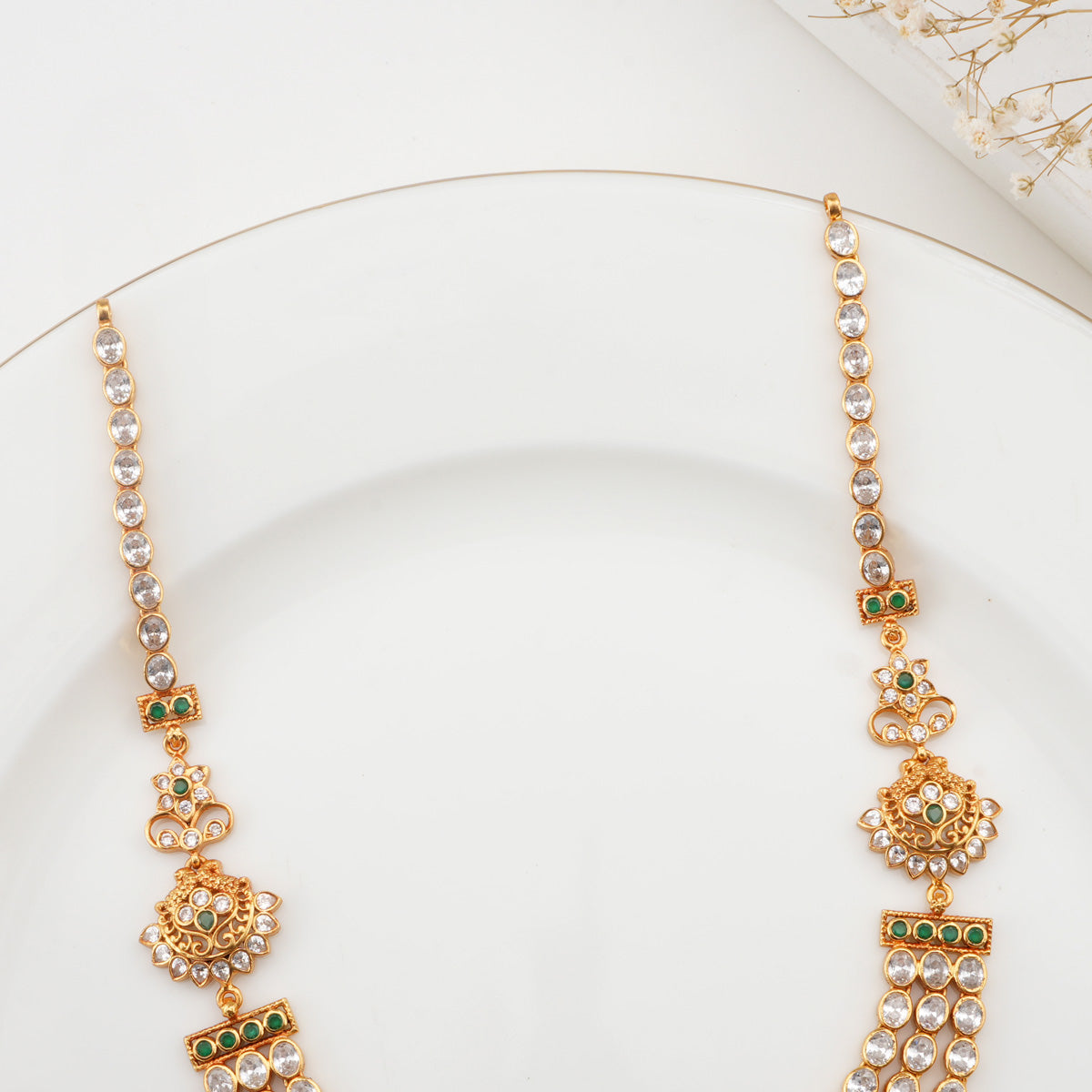 This elegant Short Necklace features 92.5% pure silver and 24 karat gold plating, adorned with high-quality semi-precious stones. It is the ideal accessory for any formal event.