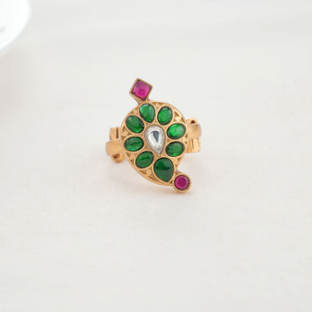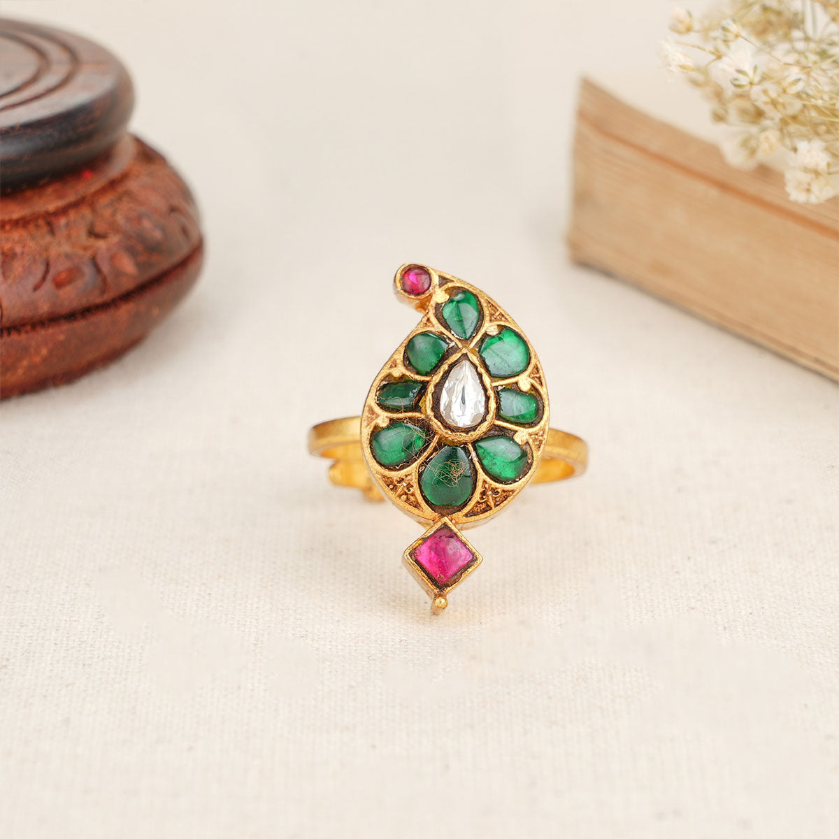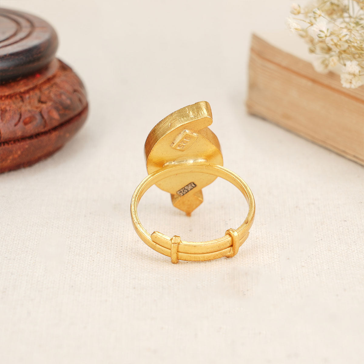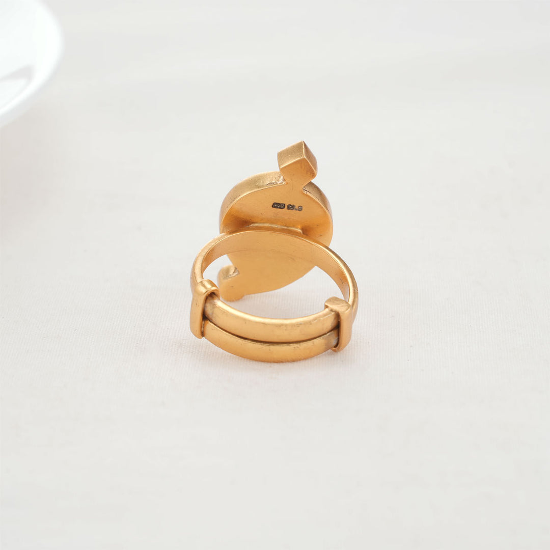 This 92.5 Silver, 24 kt Gold-Plated Ring is adorned with Semi-precious Kundan Stones for a luxurious aesthetic.