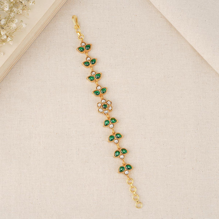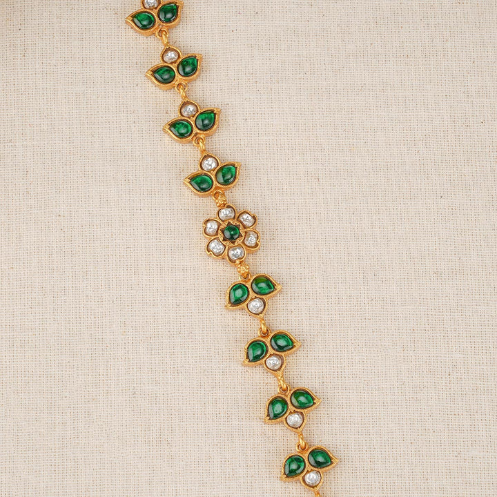 This 92.5 Silver, 24 kt Gold-Plated bracelet is adorned with Semi-precious Kundan Stones for a luxurious aesthetic.