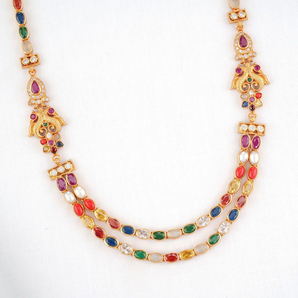 This elegant Necklace is made of 92.5 Silver and features a 24 kt gold-plated design. Adorned with semi-precious stones, it makes a gorgeous statement for any occasion.