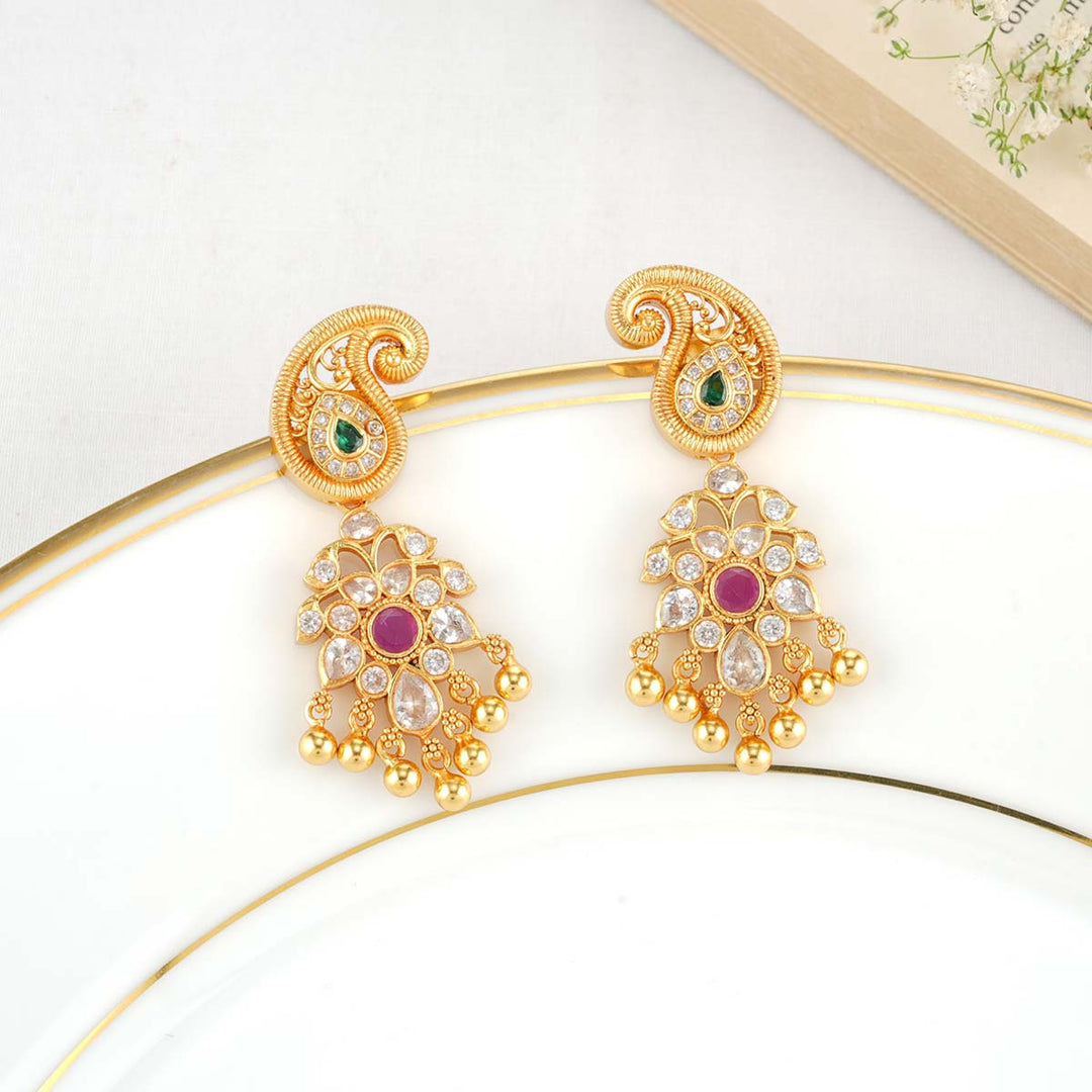 These earrings are crafted from 92.5 silver and 24kt gold-plated metals, with semi-precious stones embedded for added sparkle.
