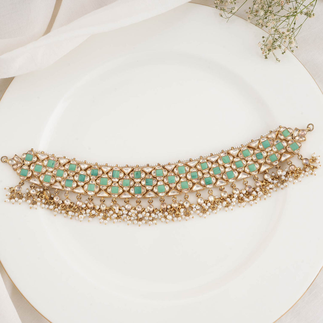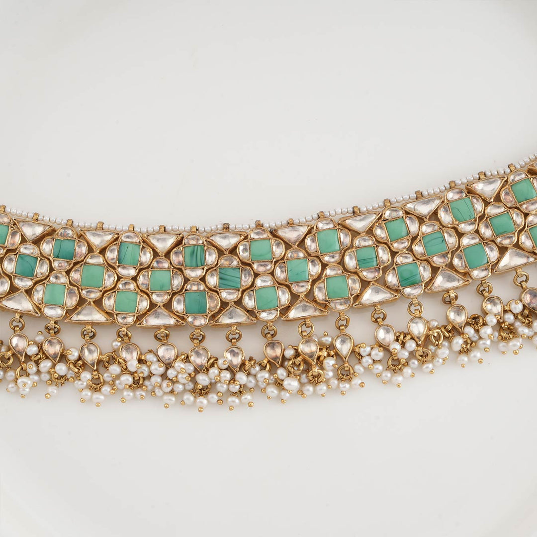 This 92.5 Silver, 24 kt Gold-Plated Necklace is adorned with Semi-precious Kundan Stones for a luxurious aesthetic.
