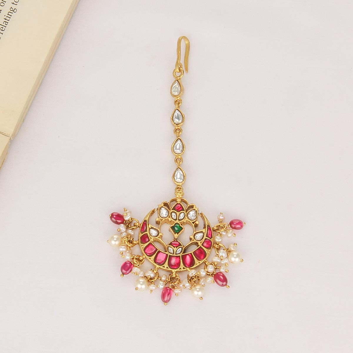 This 92.5 Silver, 24 kt Gold-Plated Maangtikka is adorned with Semi-precious Kundan Stones for a luxurious aesthetic.