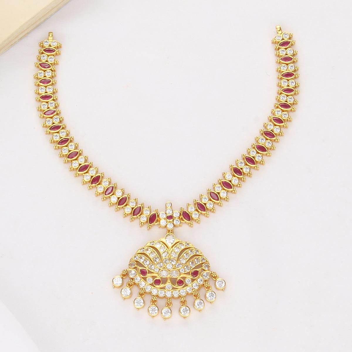 This 92.5 Silver, 24 kt gold-plated Necklace is studded with semi-precious stones to make a stunning statement. Perfect for any special occasion.