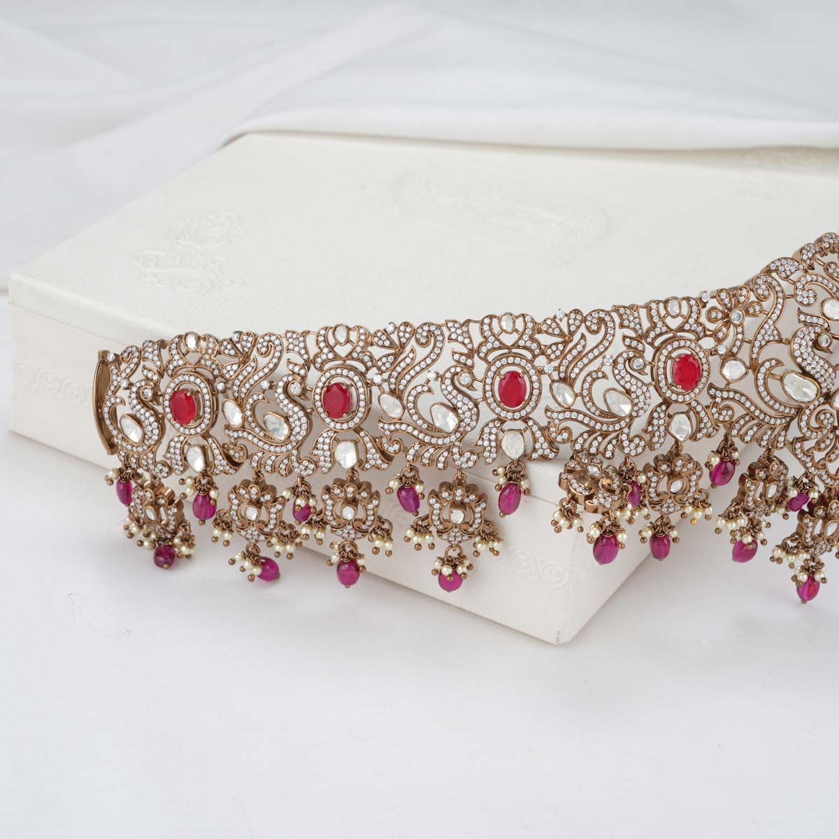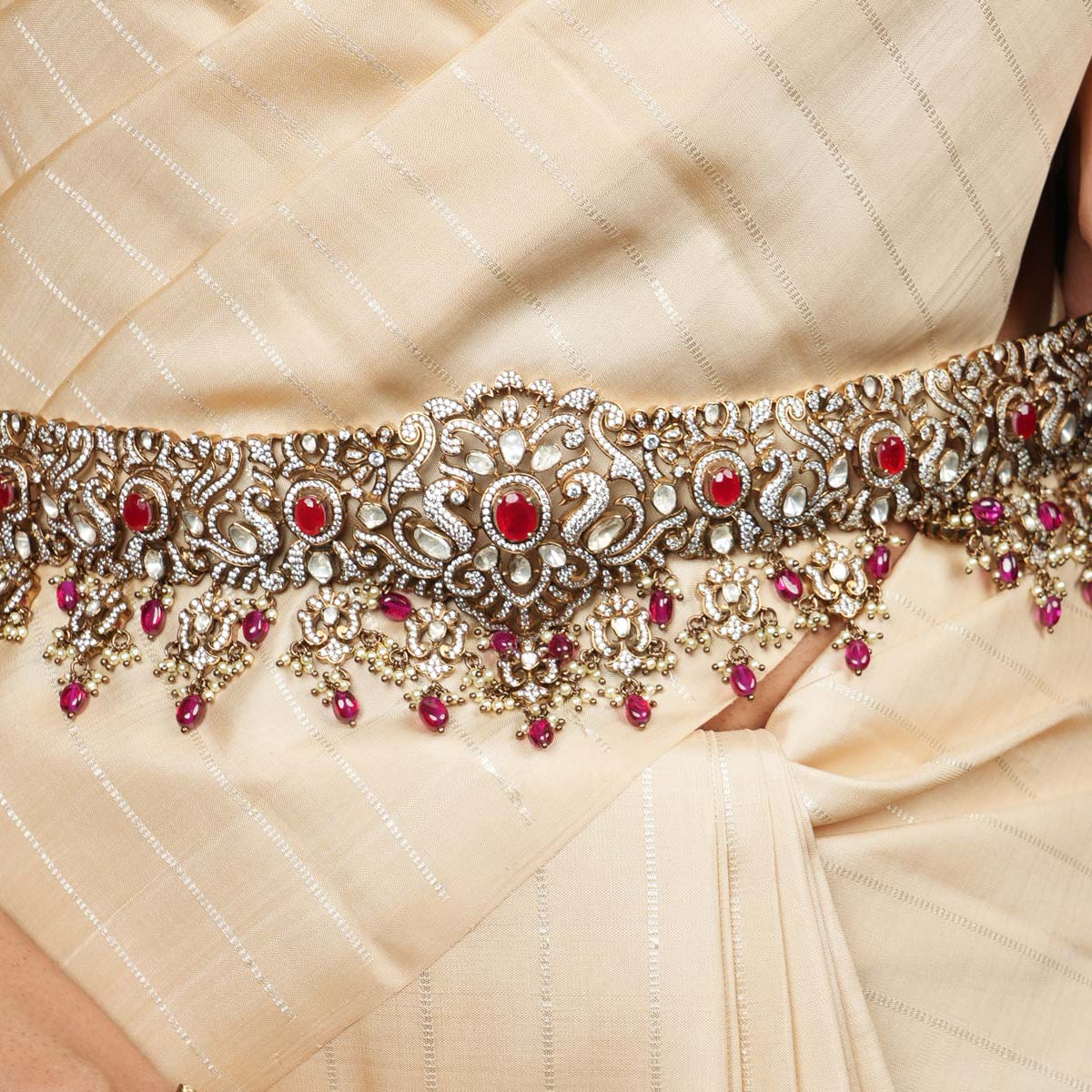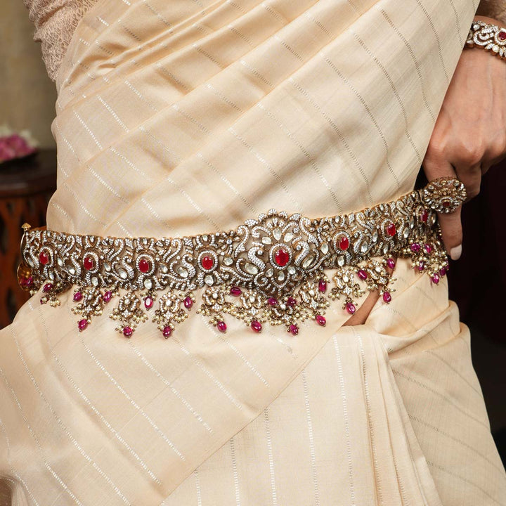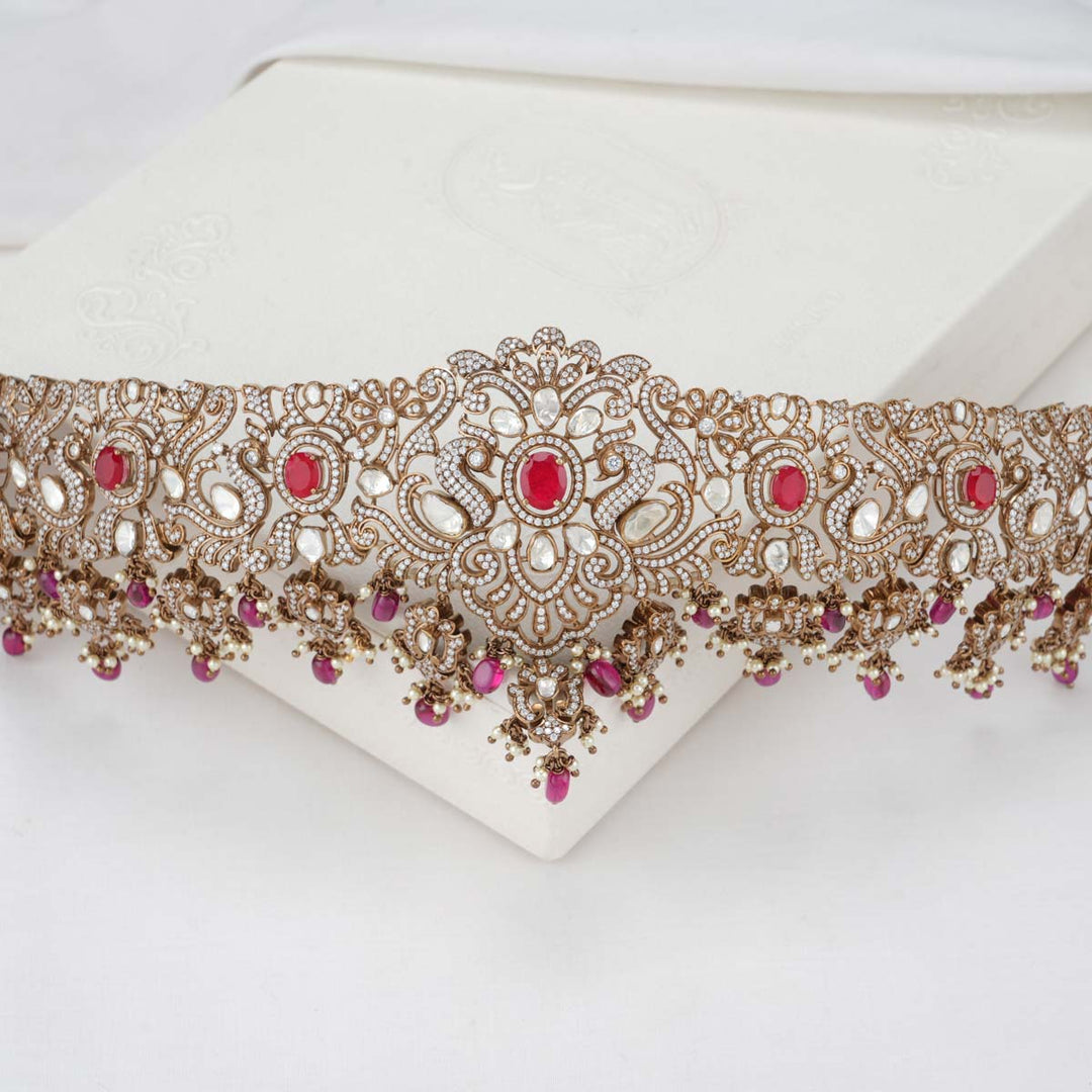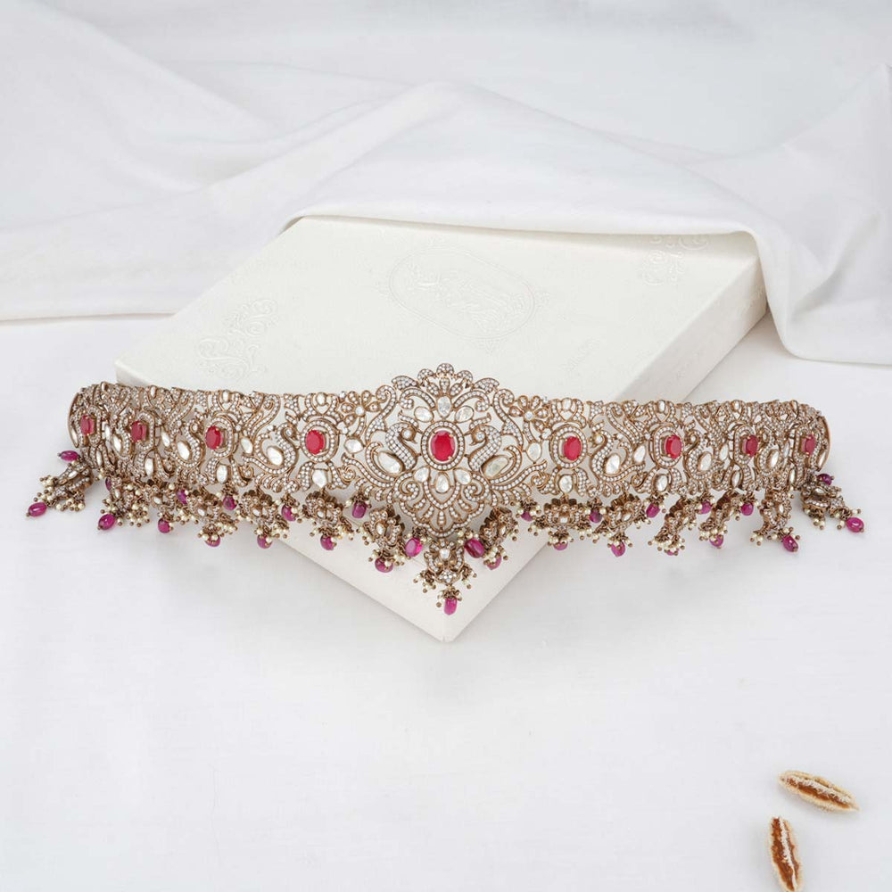92.5 Silver, Victorian Oddiyanam studded with Gem Stones and Pearl Beads.