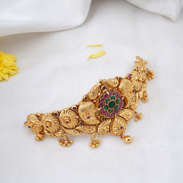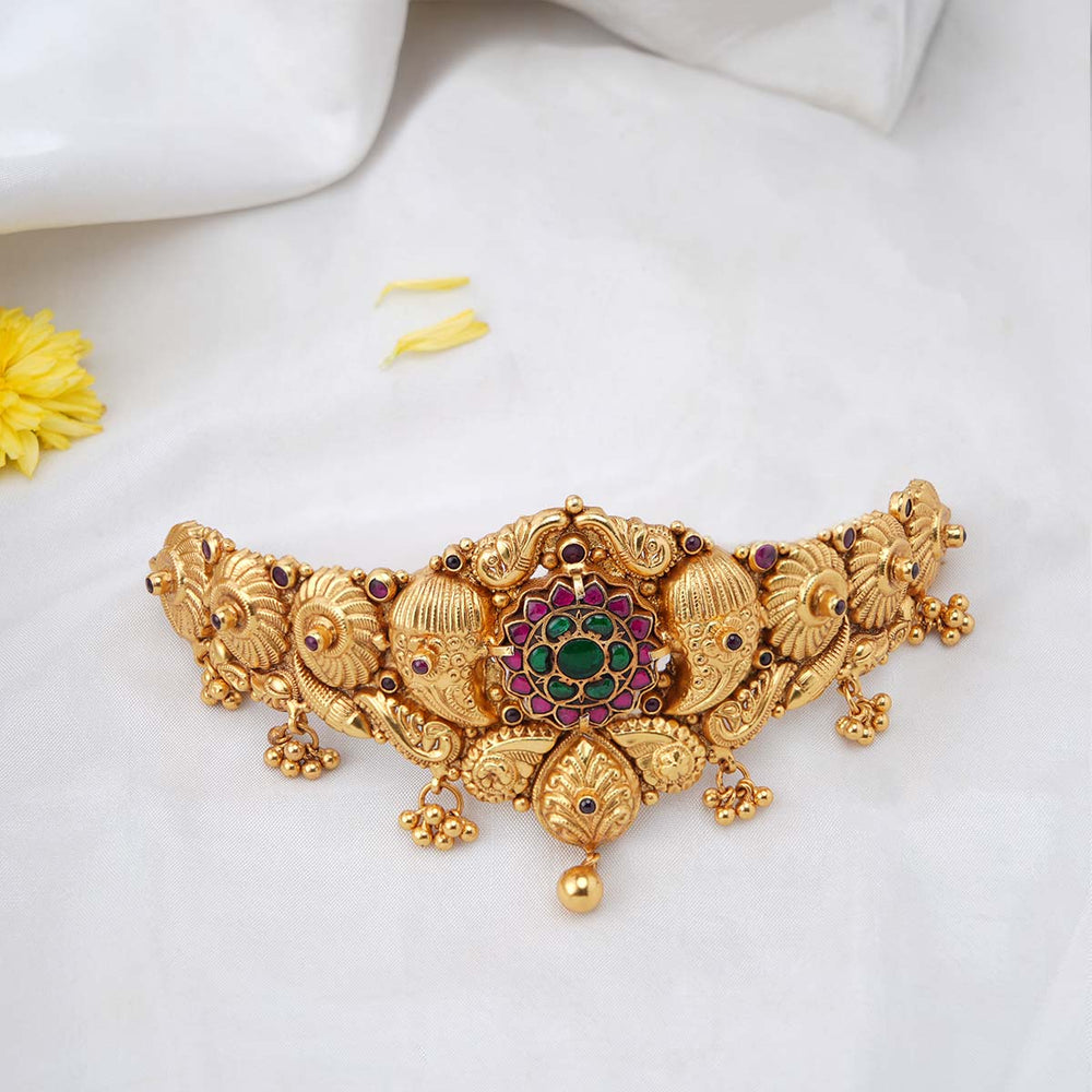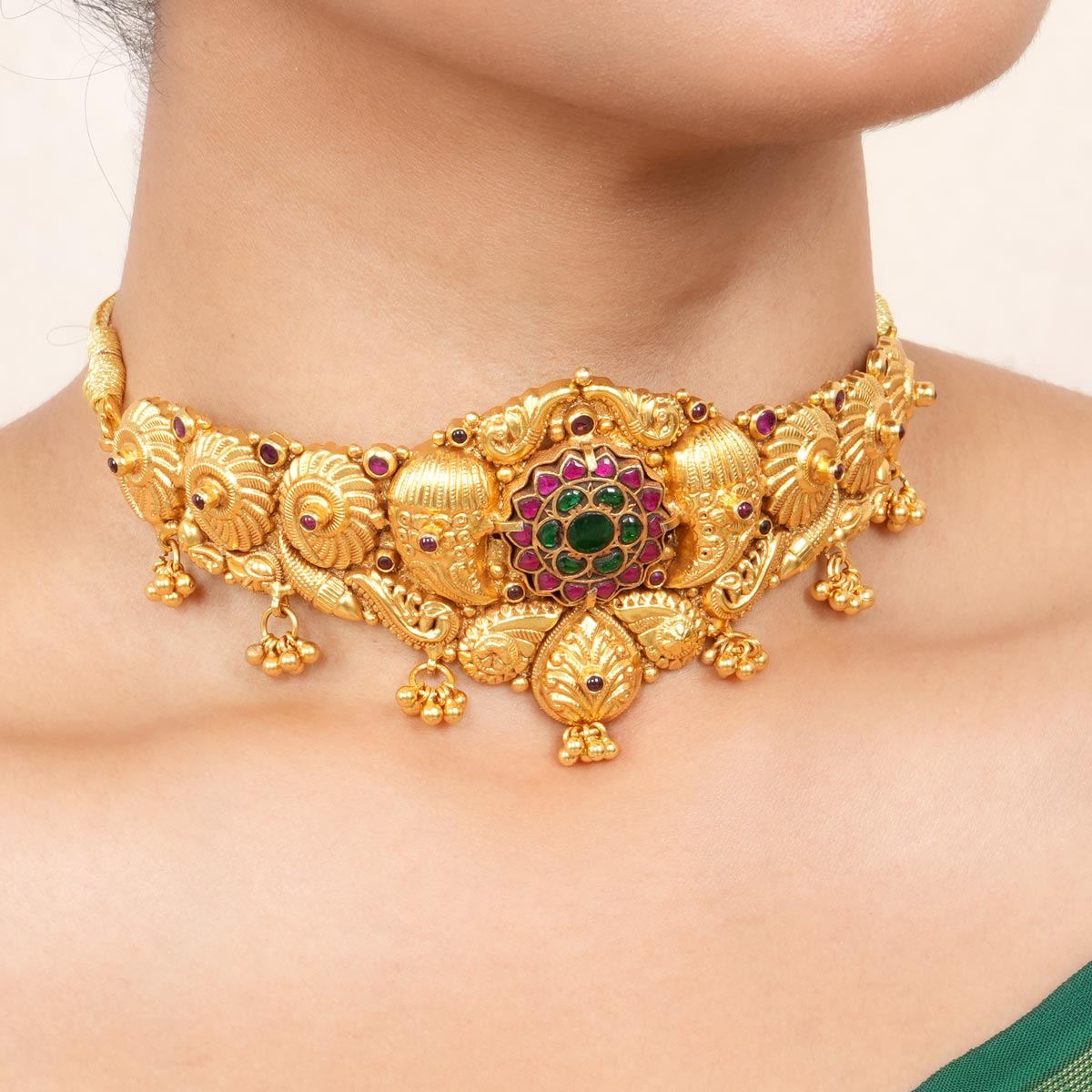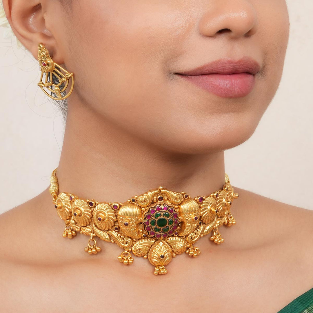 This 92.5 Silver, 24 kt gold-plated stylish Necklace is studded with semi-precious stones to make a stunning statement. Perfect for any special occasion.