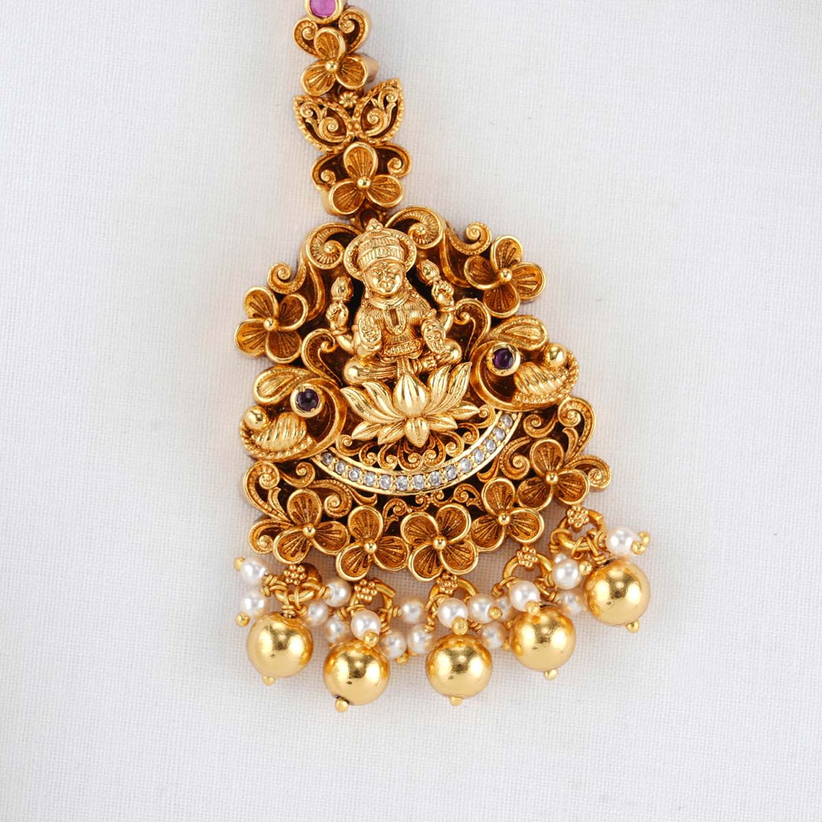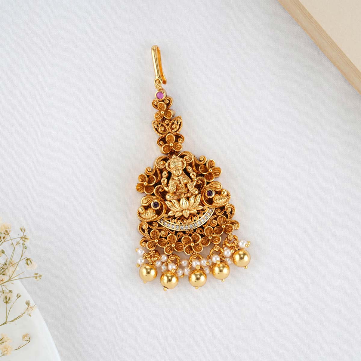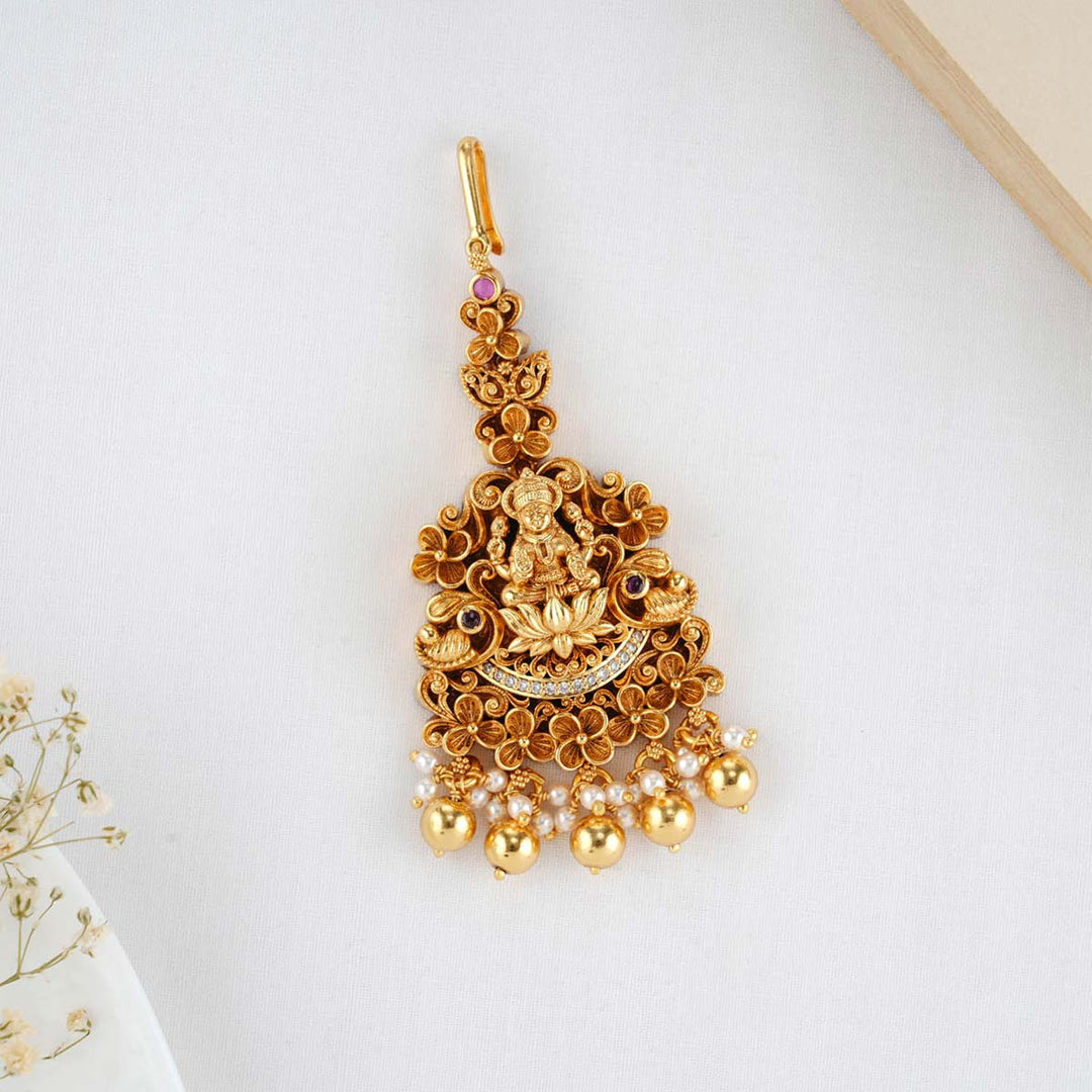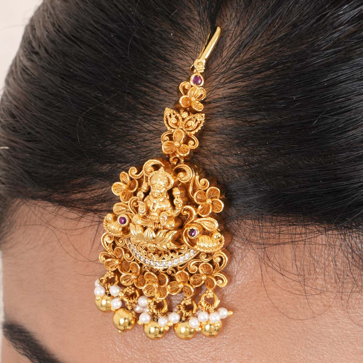 This exquisite Maangtikka will add a glamorous flair to your look. Crafted from 92.5 silver and 24kt gold-plated, it features semi-precious stones for a brilliant shine. Elevate your look with this luxurious Maangtikka.