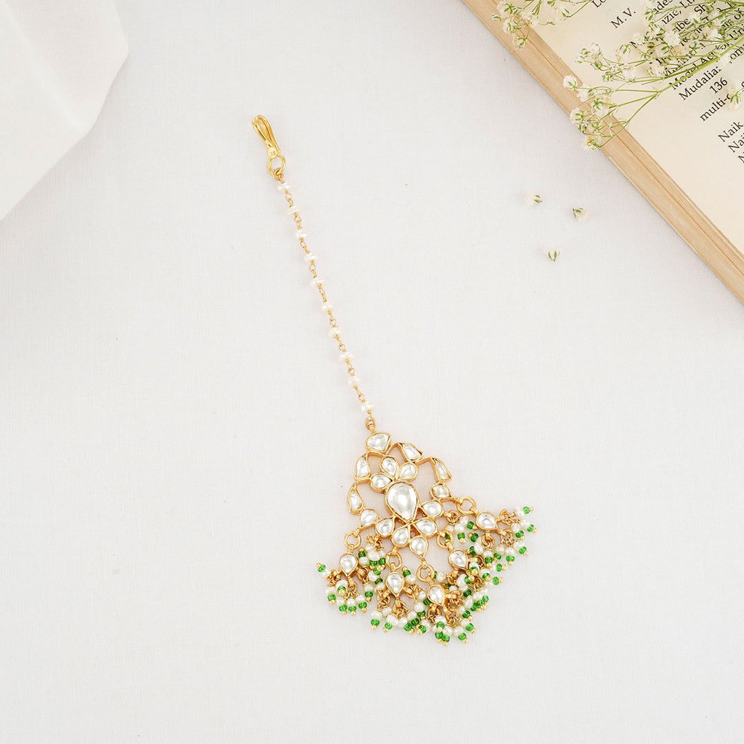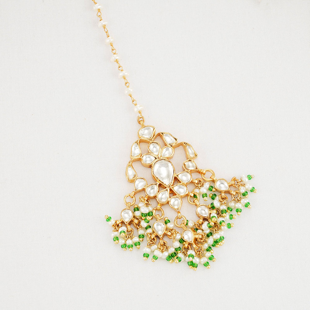 This Kundan Maangtikka is crafted with 92.5 silver-gold plating. It will add a sophisticated touch to any special occasion look. With its timeless elegance, it is sure to make an eye-catching statement.