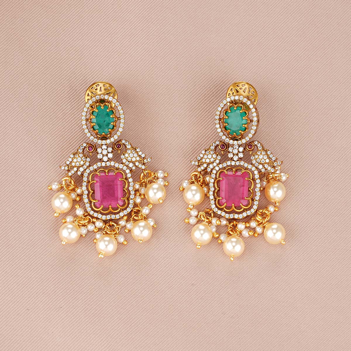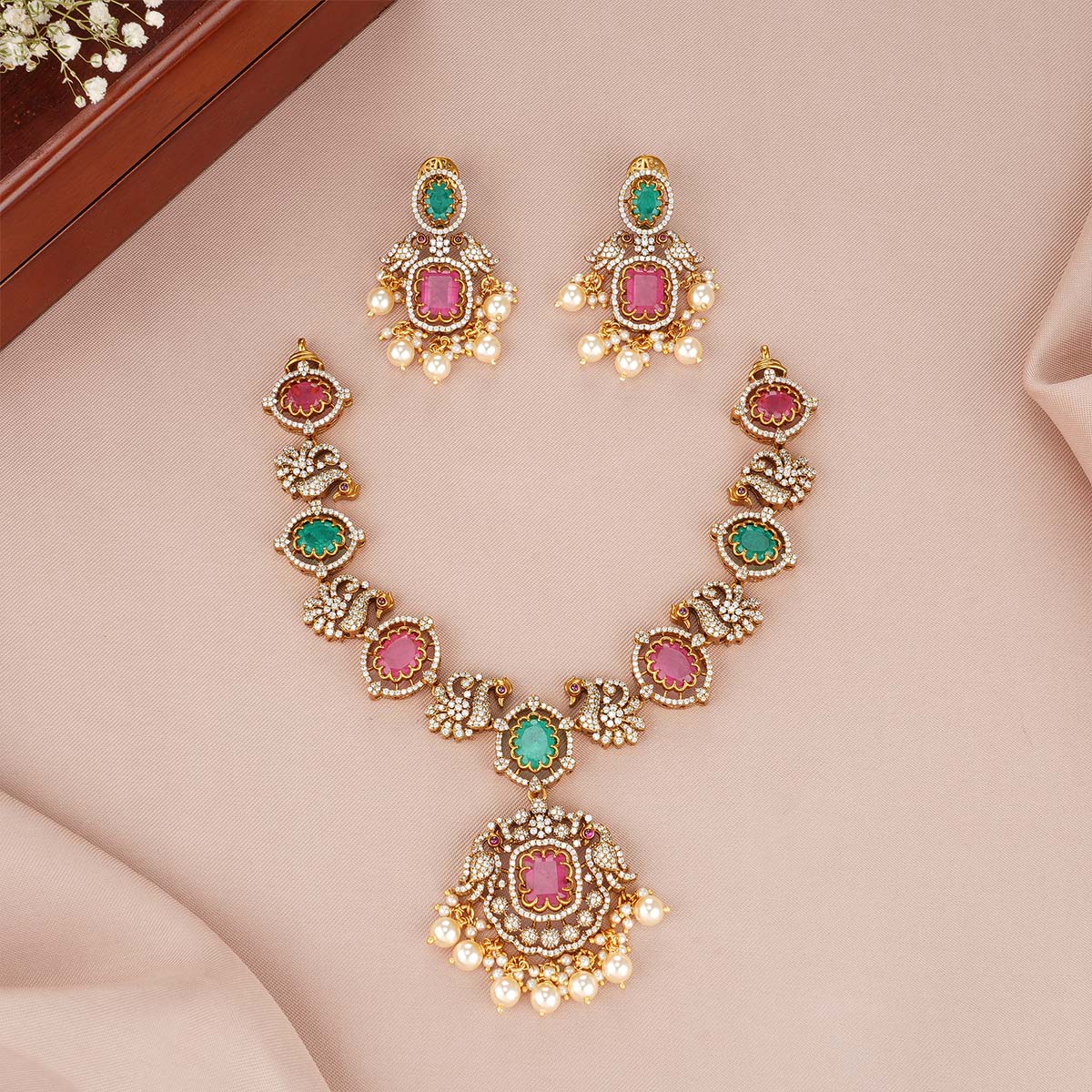 92.5 Silver, Victorian Necklace set studded with Gem Stones and Pearl Beads.