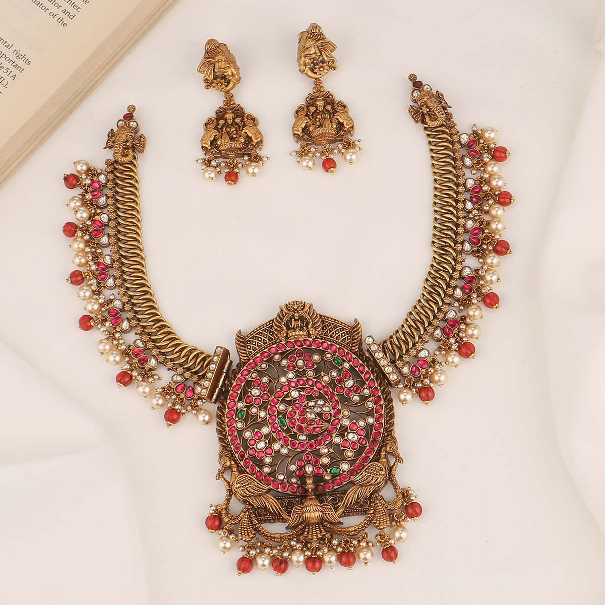 Crafted from 92.5 Silver and 24kt Gold Plated, this elegant Nagas Necklace Set features stunning semi-precious stones for a truly dazzling effect. Its unique design and exquisite style will undoubtedly make a grand impression.