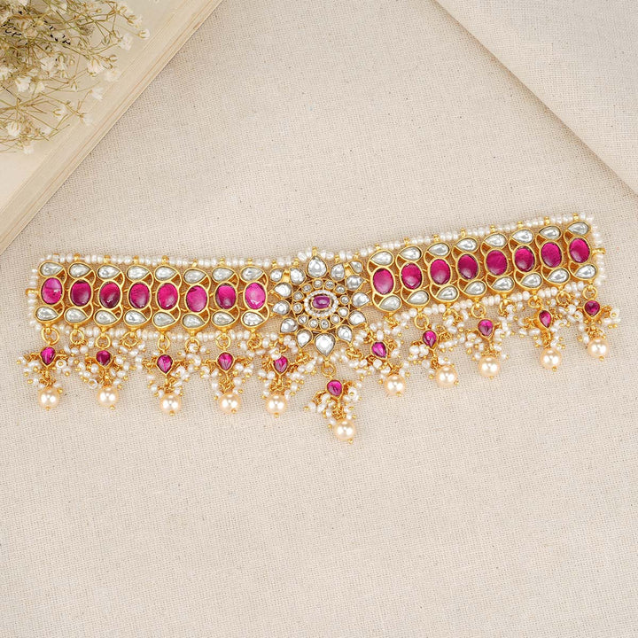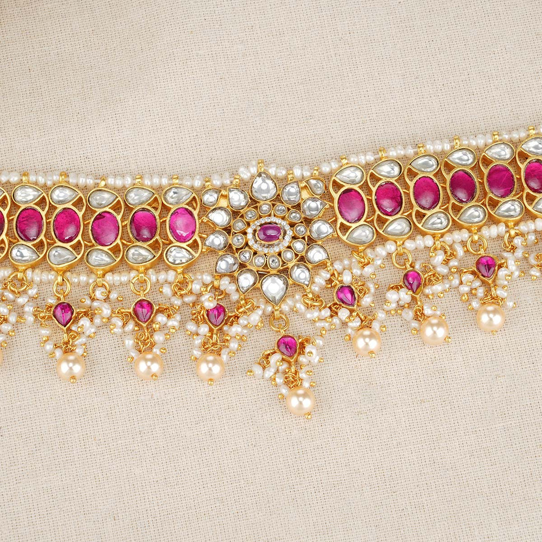 This 92.5 Silver, 24 kt Gold-Plated Choker is adorned with Semi-precious Kundan Stones for a luxurious aesthetic.