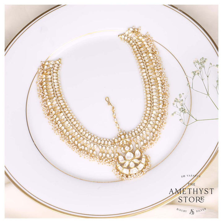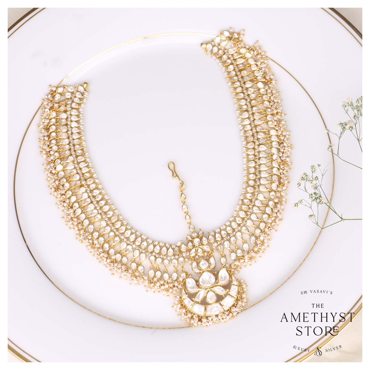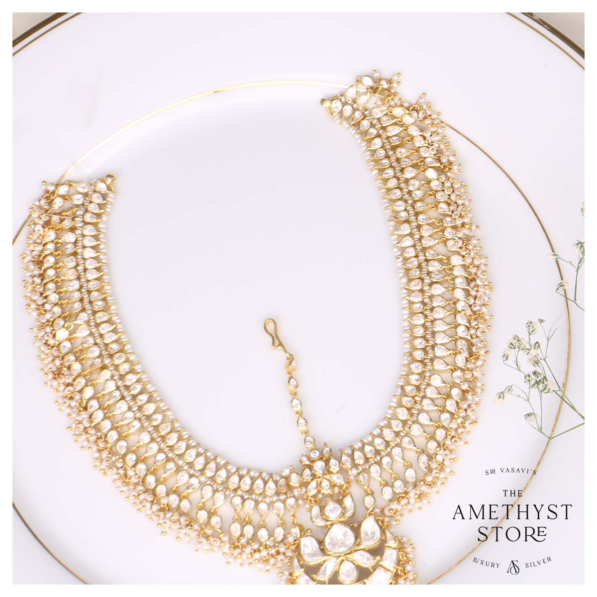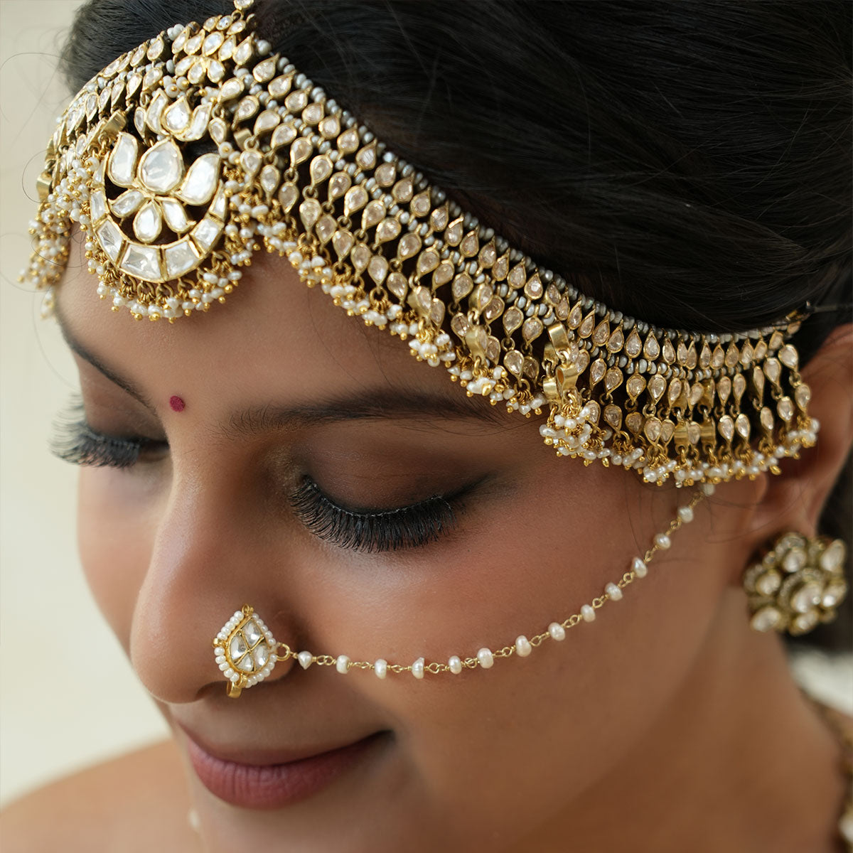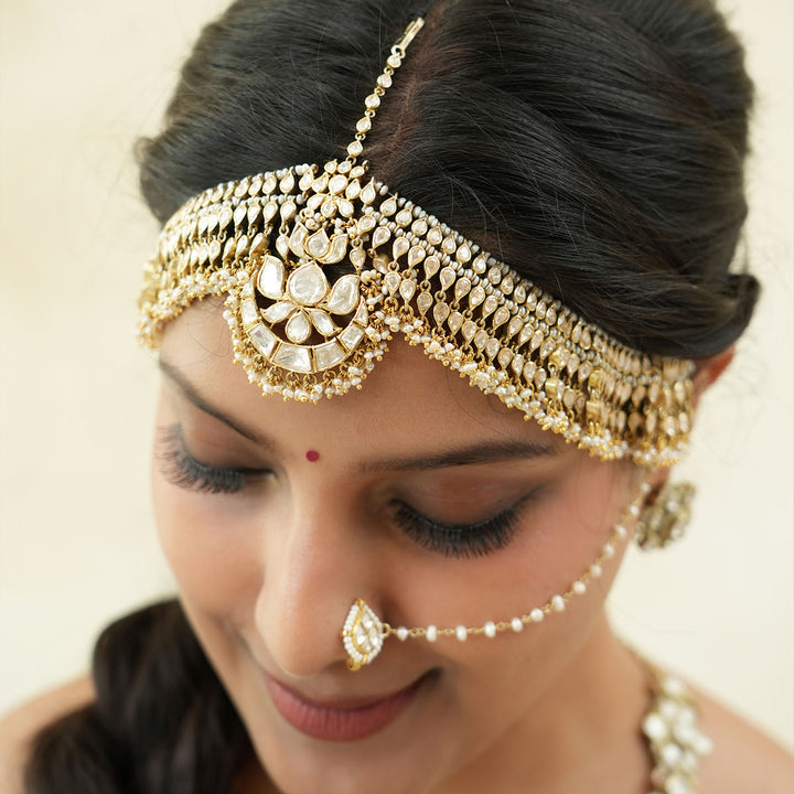 This elegant maangtikka is plated in 92.5 Silver Gold, making it a perfect accessory for weddings and formal occasions. Its delicate design is sure to draw attention and elevate any outfit.