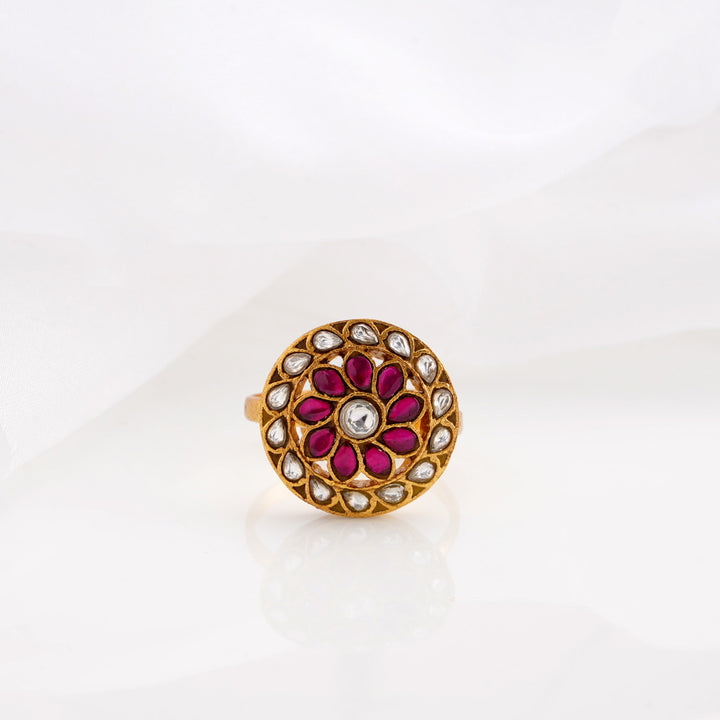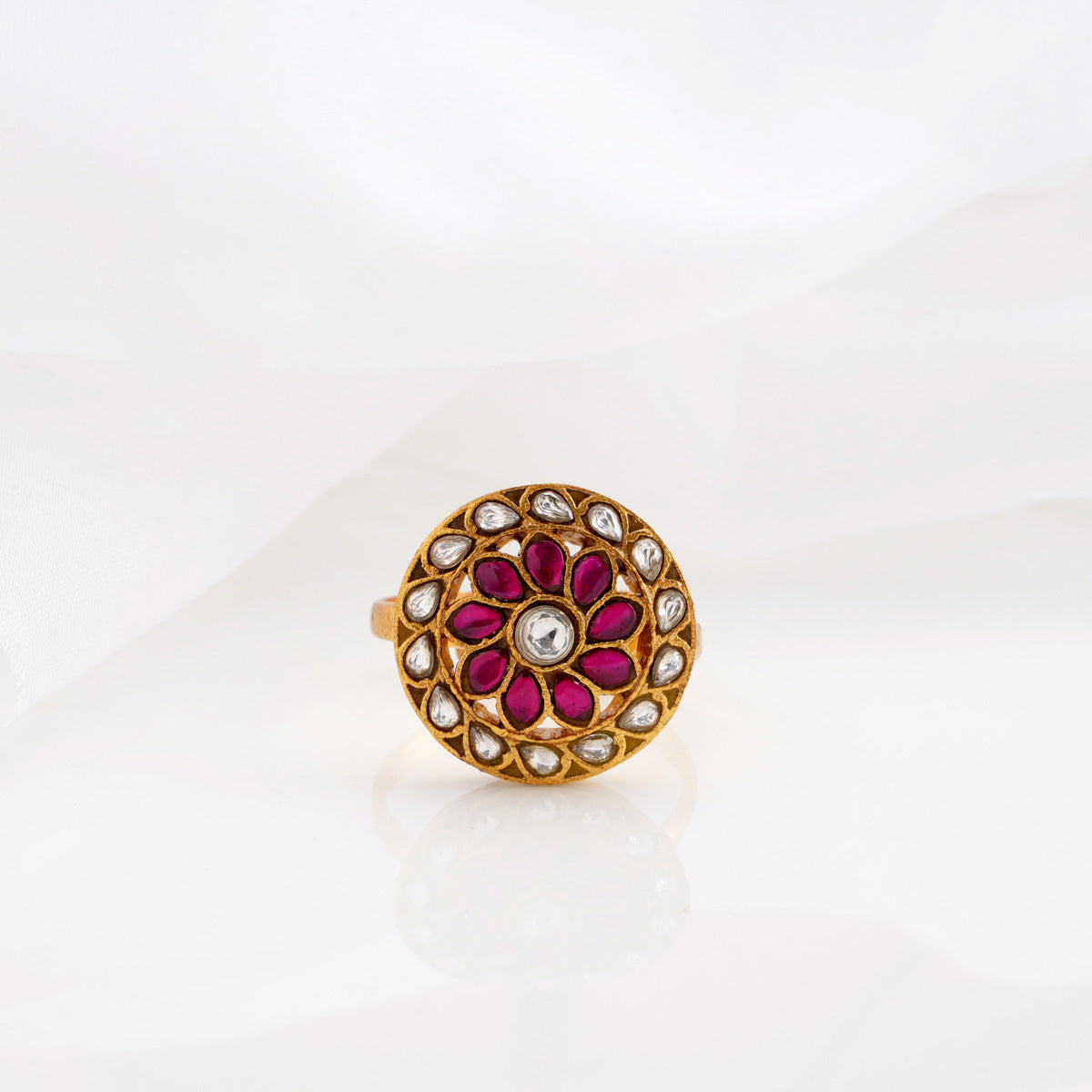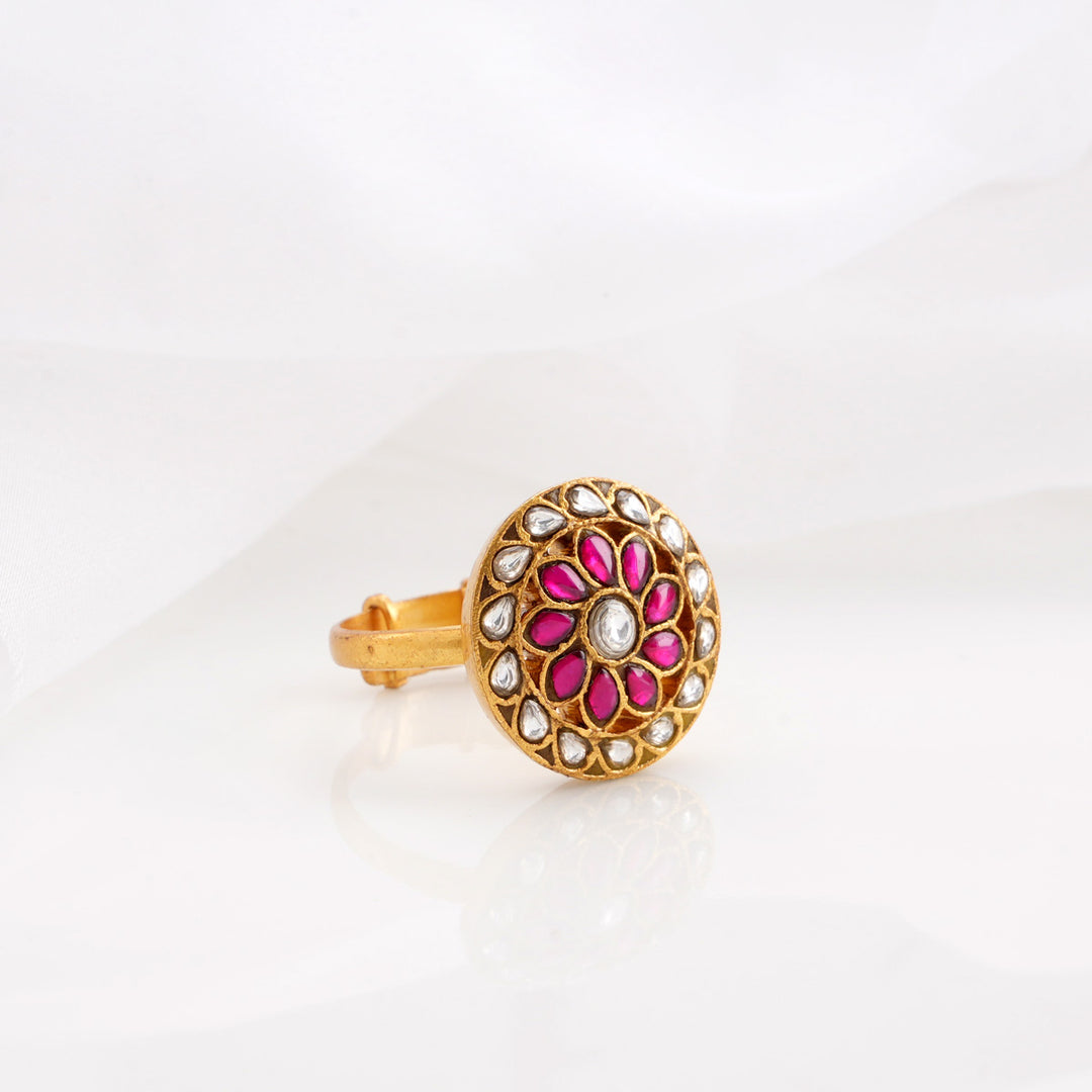 This 92.5 Silver, 24 kt Gold-Plated Ring is adorned with Semi-precious Kundan Stones for a luxurious aesthetic.