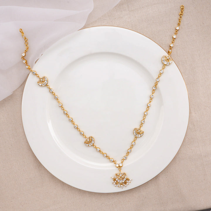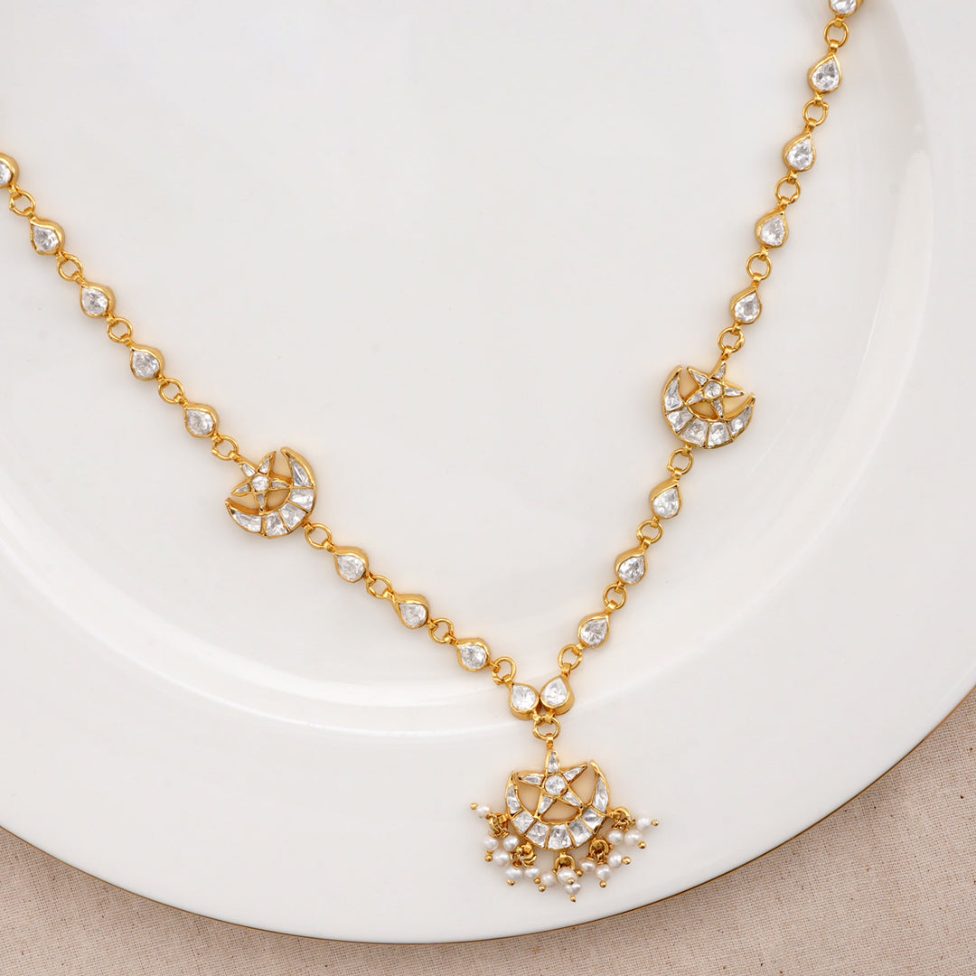 This necklace is crafted from 92.5 Sterling Silver and features 24-karat gold plating as well as Moissanite stones.