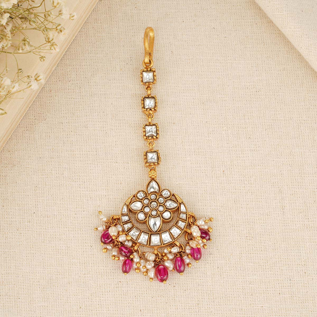This 92.5 Silver, 24 kt Gold-Plated Maangtikka is adorned with Semi-precious Kundan Stones for a luxurious aesthetic.